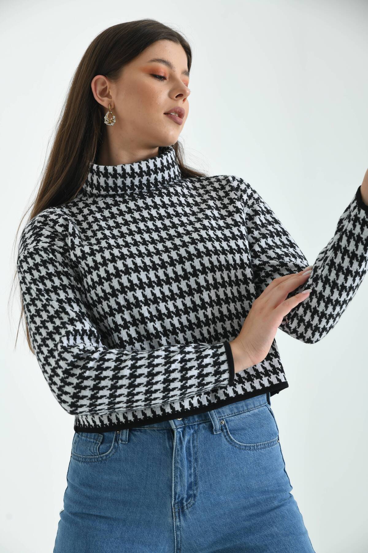 ميزات بلوزة محبوكة بنقشة مربعات ذات ياقة مدورة سوداء من MOVİMENT
