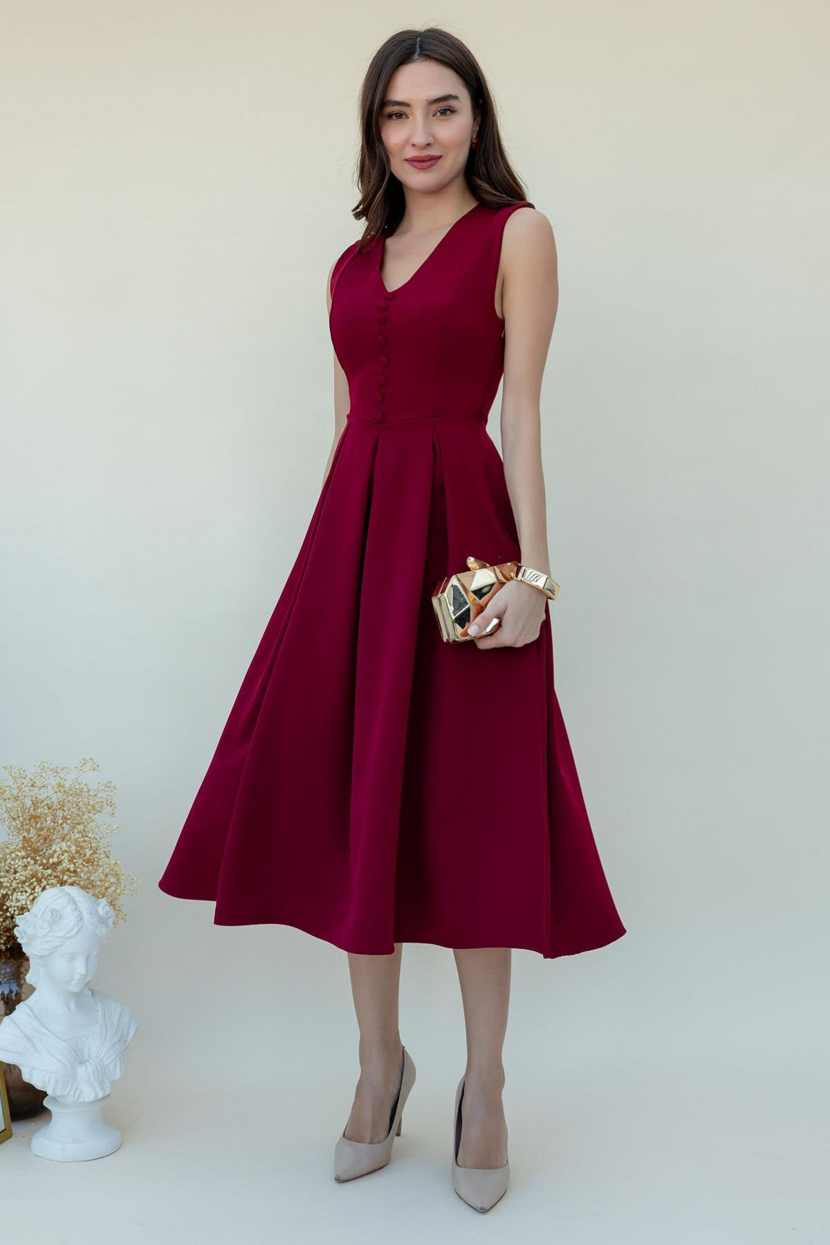 MOZENA فستان ميدي بأزرار على شكل حرف V