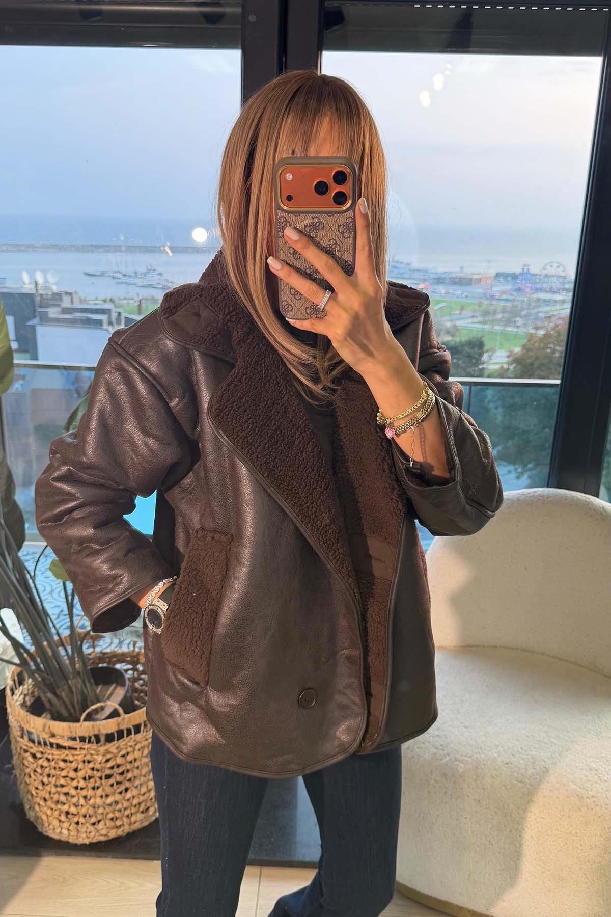 ميزات سترة من جلد الغزال بأزرار بنية من My Loore