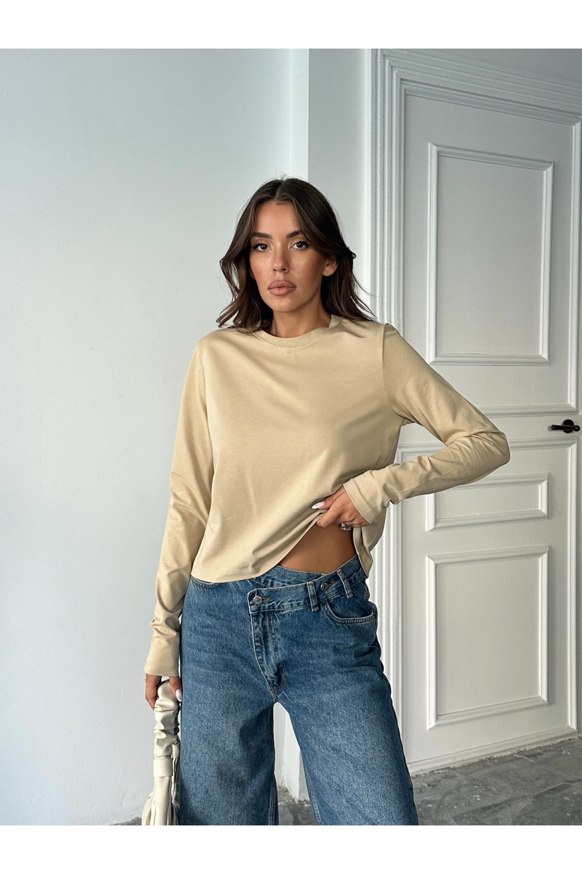 mydukkan.co بلوزة أساسية سادة بأكمام طويلة - بيج