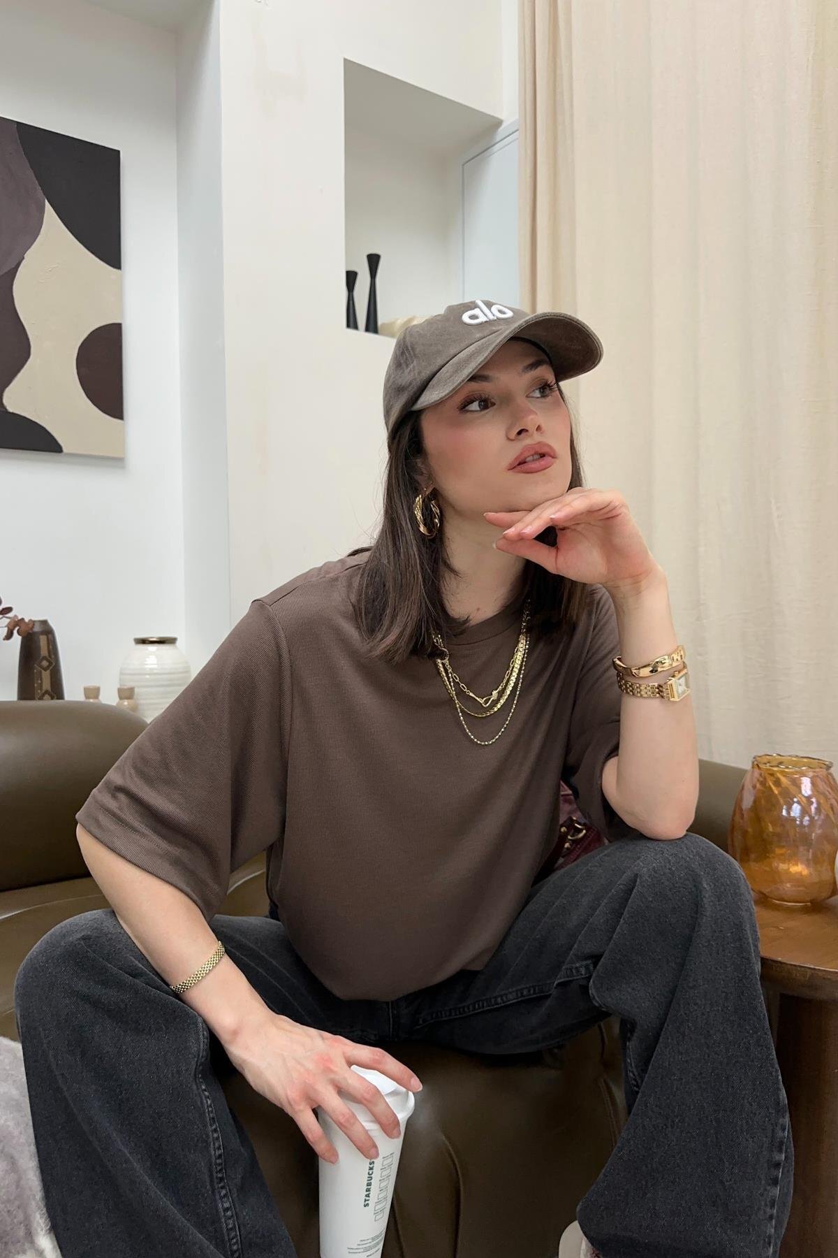 ميزات تي شيرت أساسي كبير الحجم باللون البني من mylove