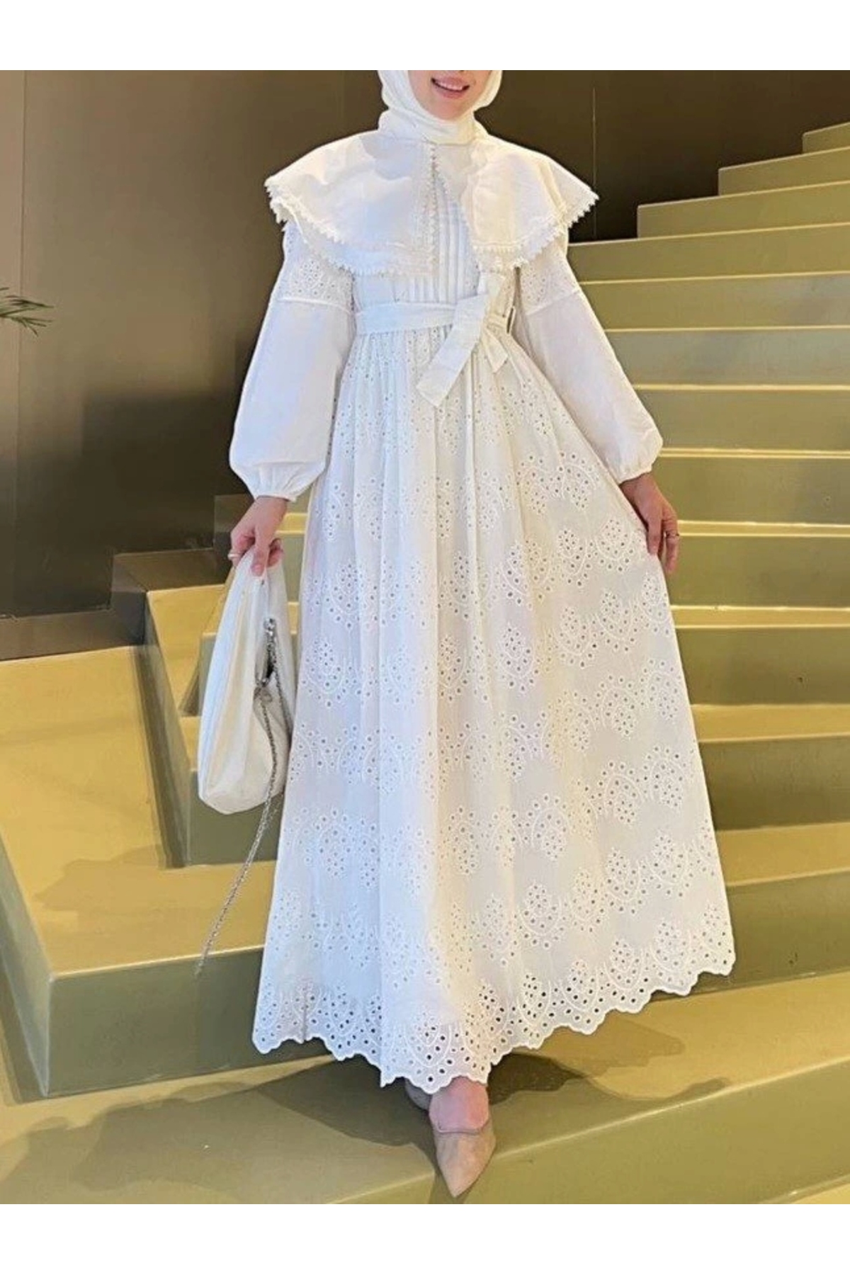 ميزات فستان بتفاصيل دانتيل وياقة كيب - أبيض من nedo7