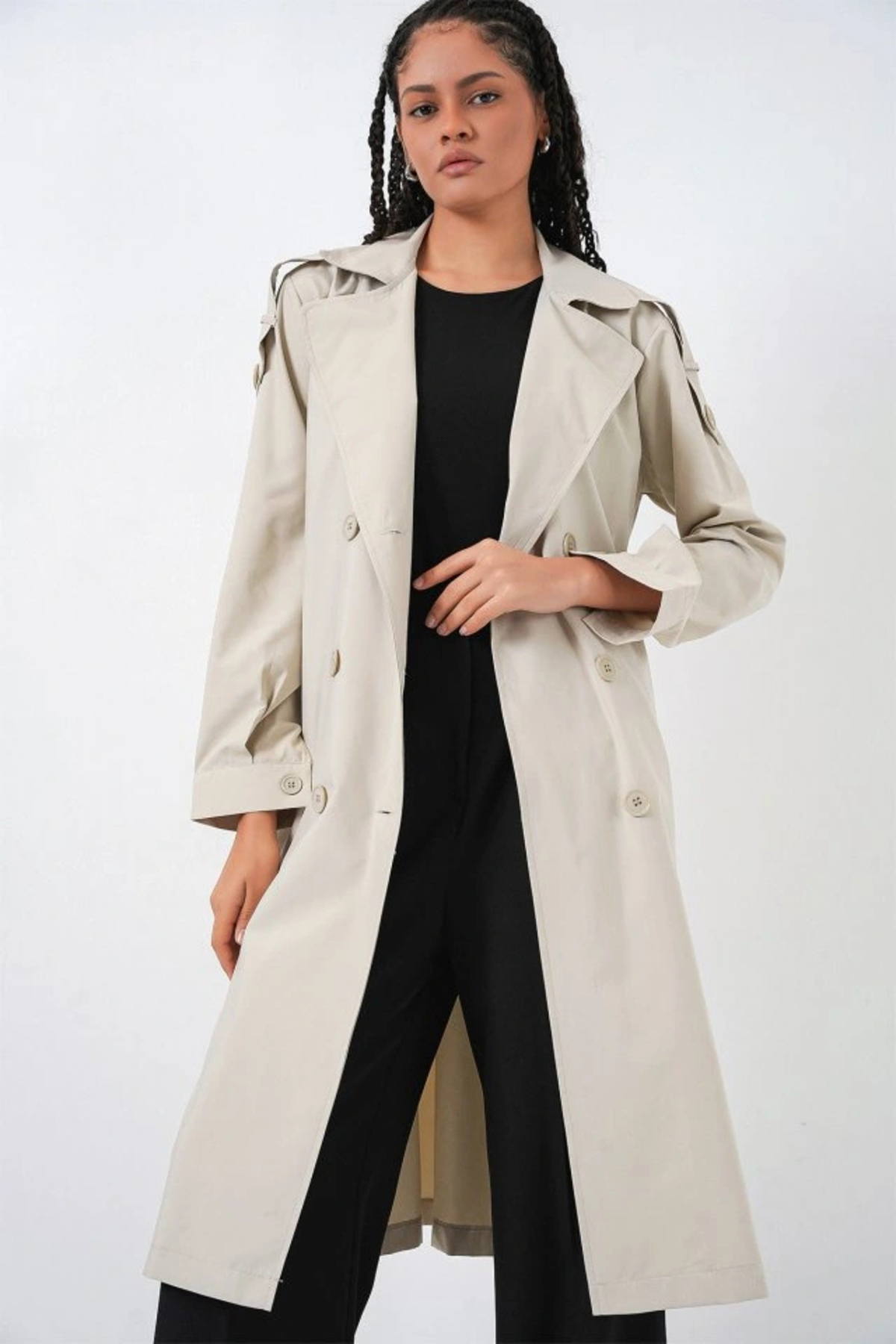 ميزات بأزرار على الجهتين معطف طويل بياقة 5978 - حجري من nedo7