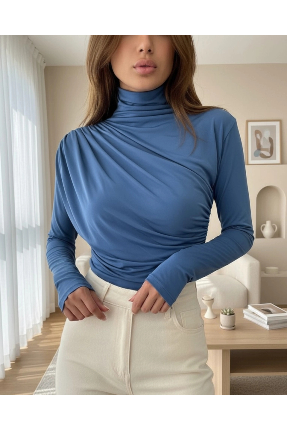 ميزات بلوزة ساندي برباط نصف الحلق - نيلي من nedo7