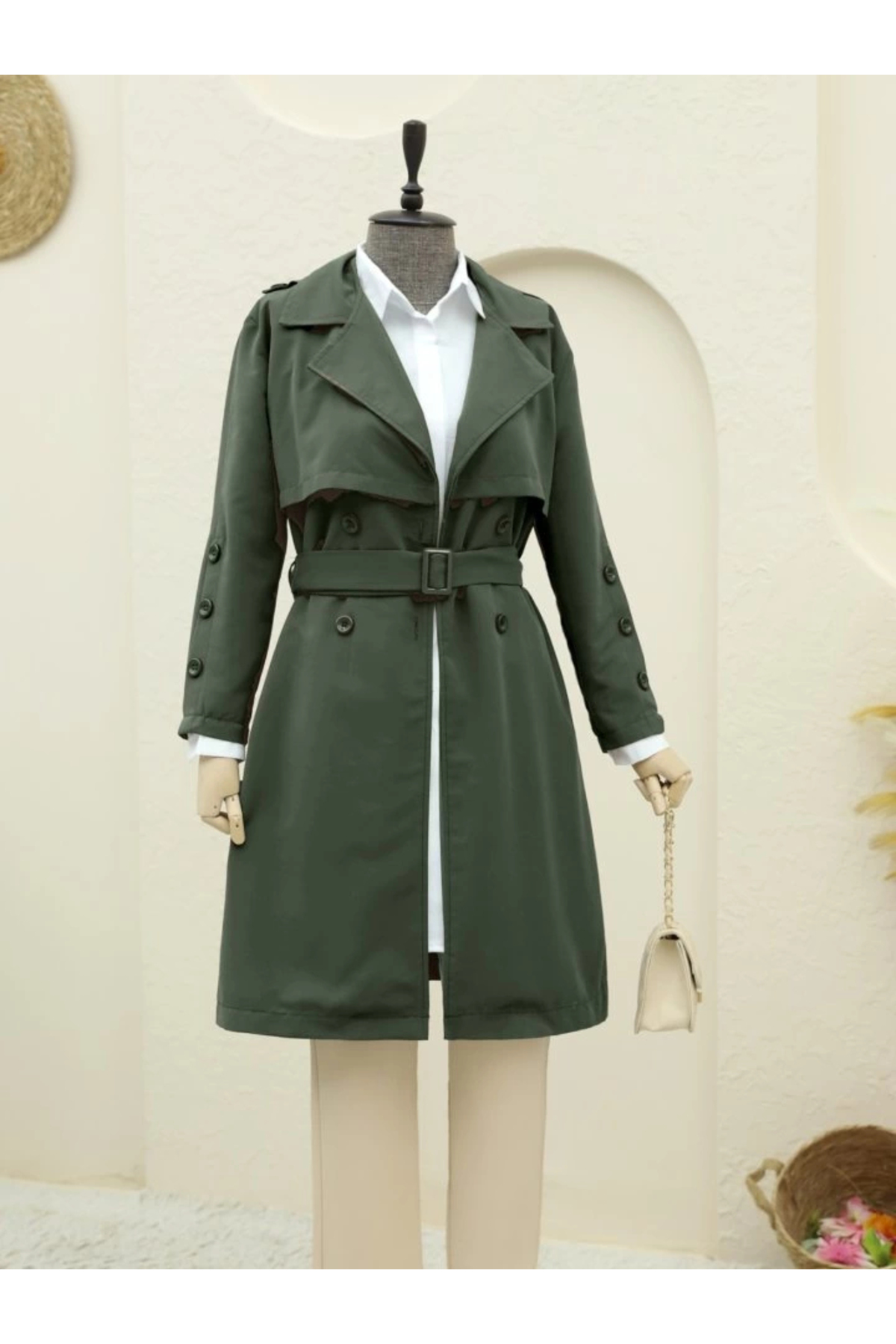 ميزات معطف مع بطانة داخلية وأزرار وحزام - كاكي من nedo7