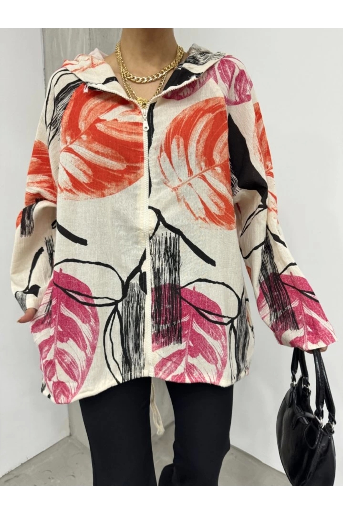 ميزات سترة من الكتان بتصميم مُزخرف بسحاب وغطاء للرأس - برتقالي من nedo7