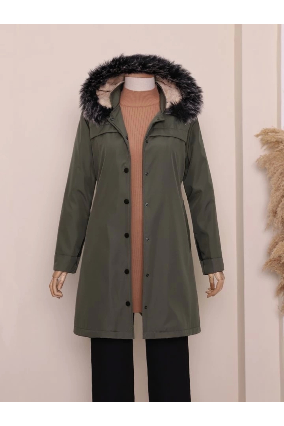 ميزات معطف قصير بغطاء للرأس وجيب بزر كبس - كاكي من nedo7