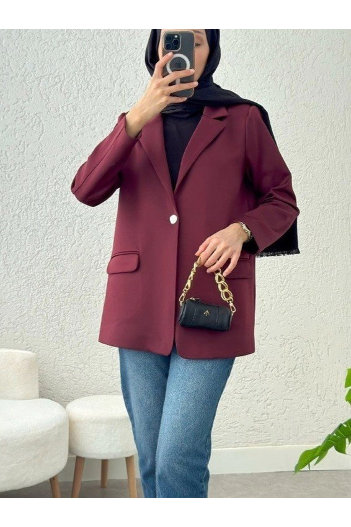 ميزات سترة ذات زر واحد مع جيوب قماش قابل للتمدد - بوردو من nedo7