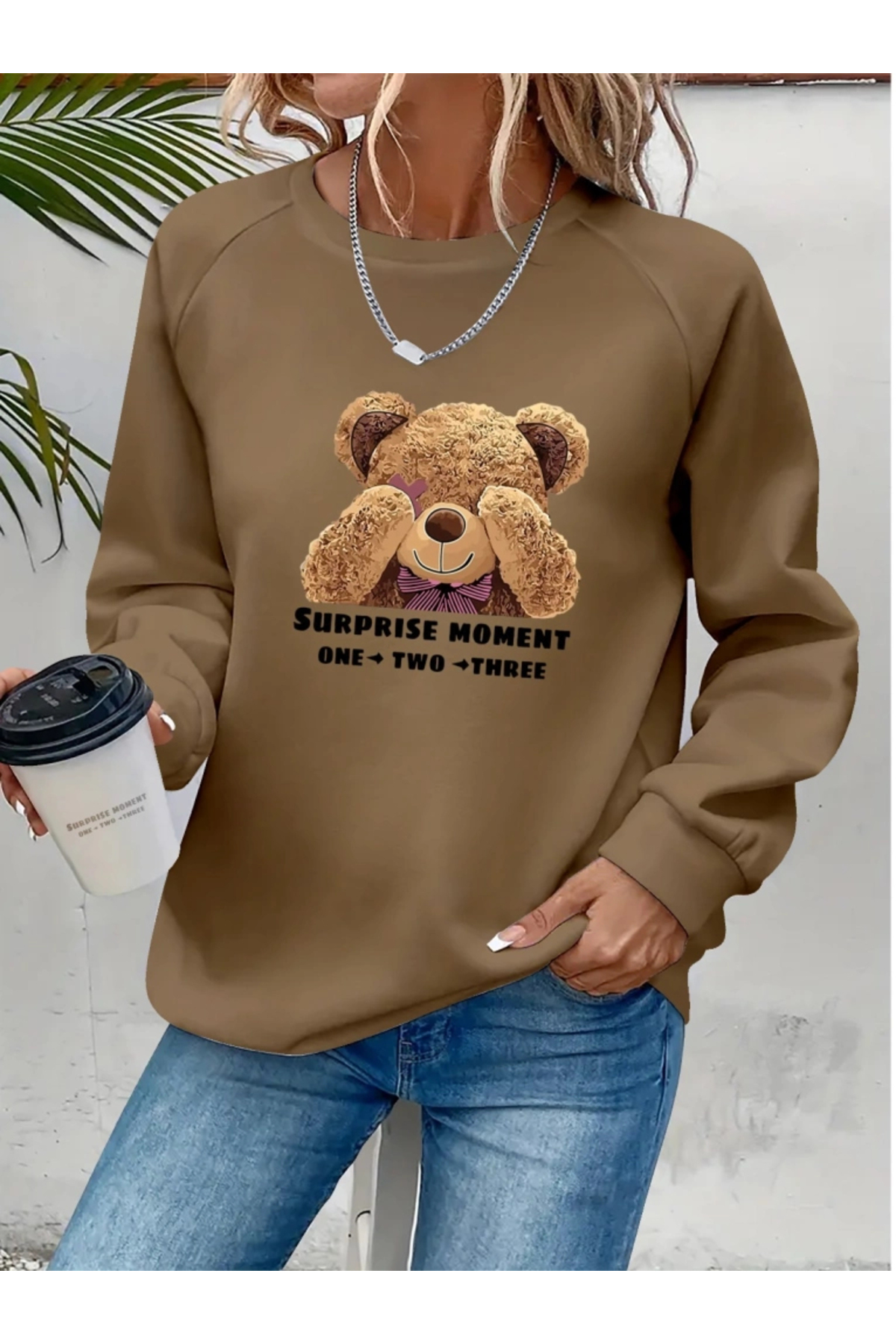 ميزات بلوزة نسائية بأكمام طويلة وياقة دائرية وطبعة دب تيدي من الفسكوز بخيطين من nedo7