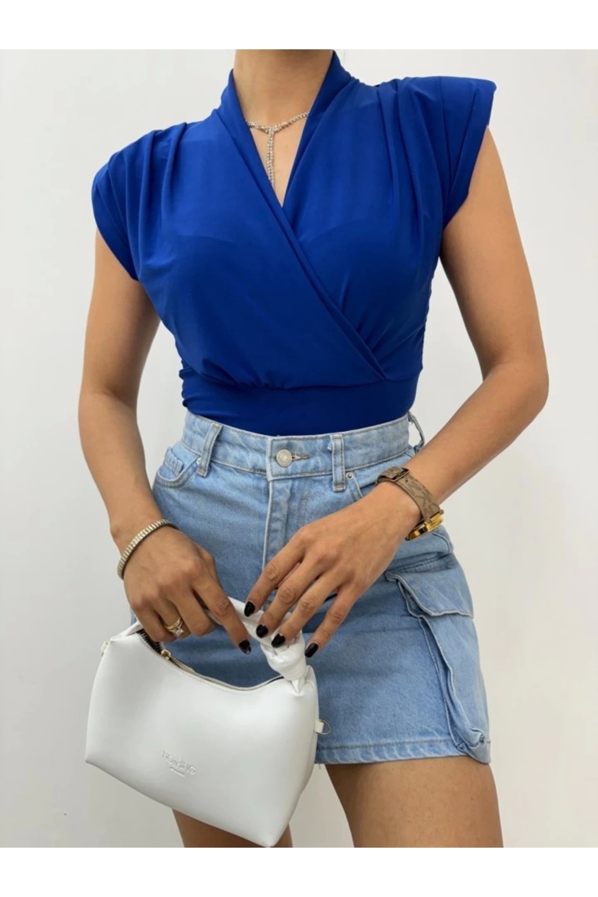 ميزات بلوزة ساندي مبطنة بدون أكمام مزدوجة الصدر - ساكس من nedo7