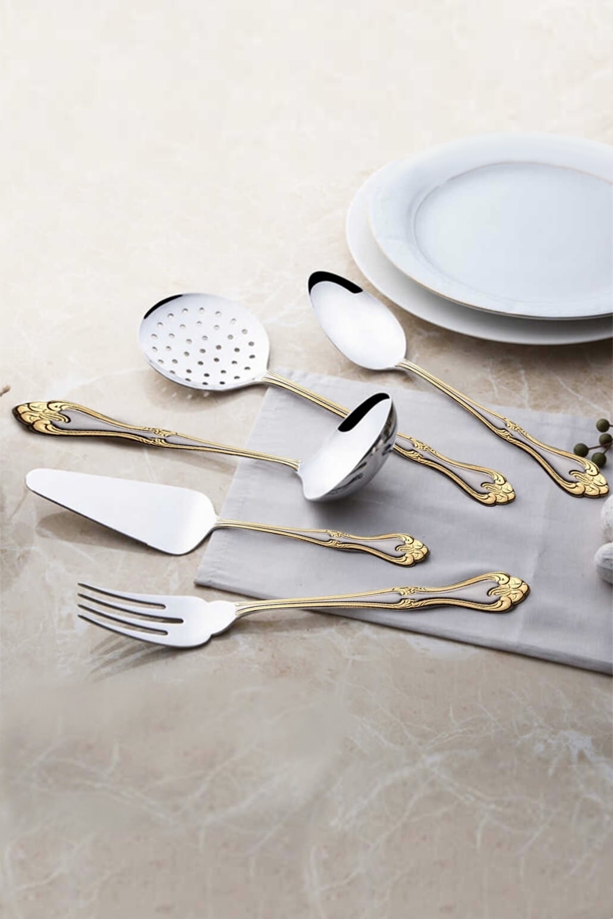 ✔️ الطقم يتكون من 5 قطع متنوعة تشمل شوكة وملعقة وسكين ومغرفة ومصفاة، تلبي جميع احتياجات تقديم الطعام.