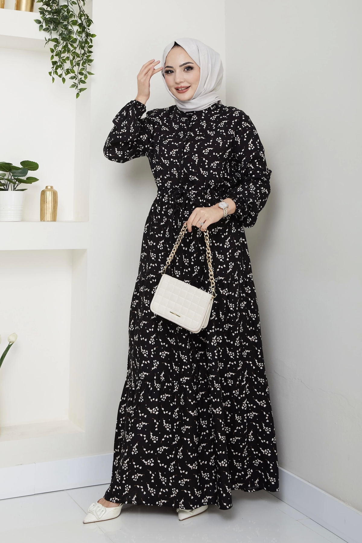 ميزات فستان فيسكوز منقوش بأوراق شجر - أسود / E0125 من Nevayla Moda