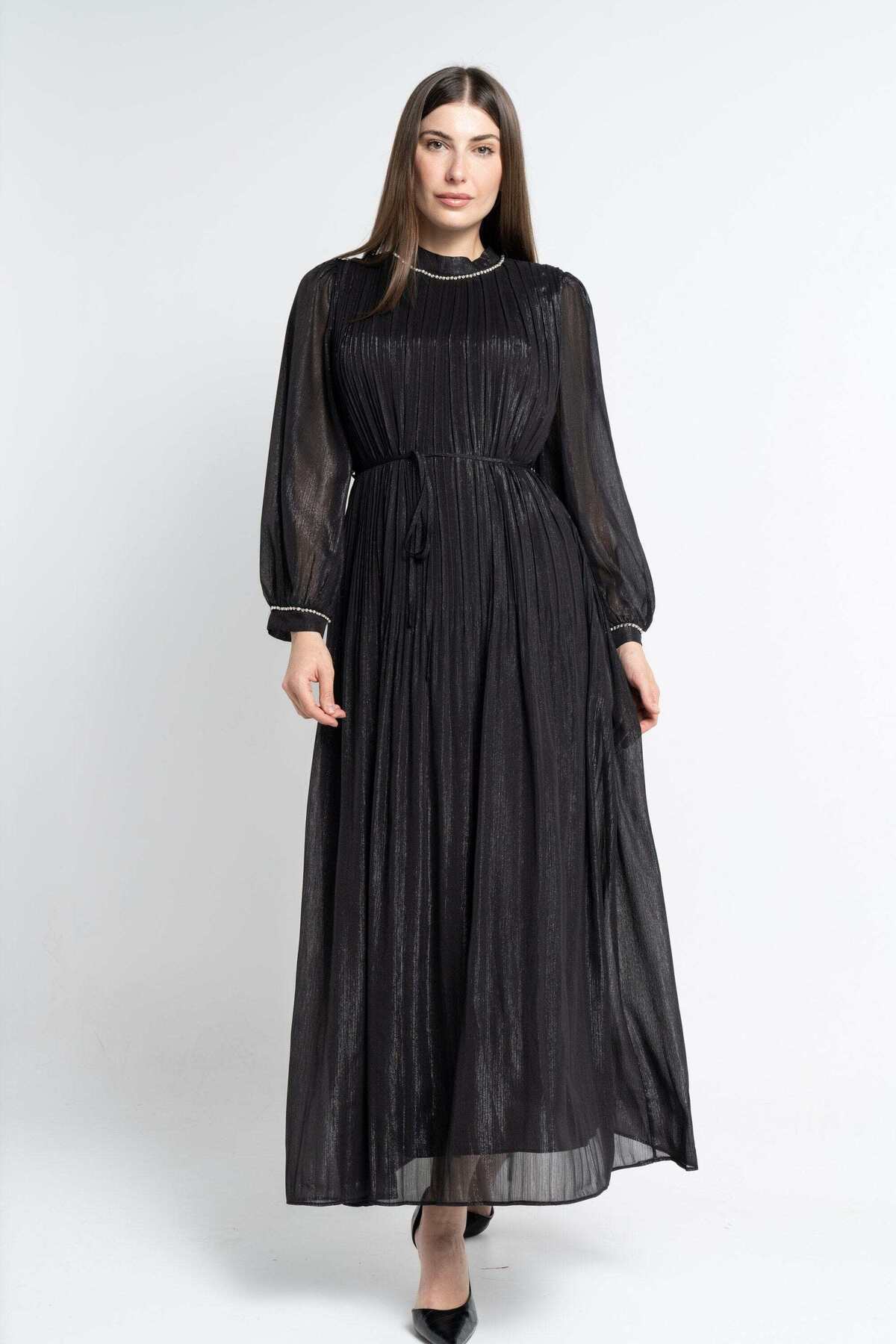 ميزات فستان ماكسي أسود سادة بحزام من Nichii