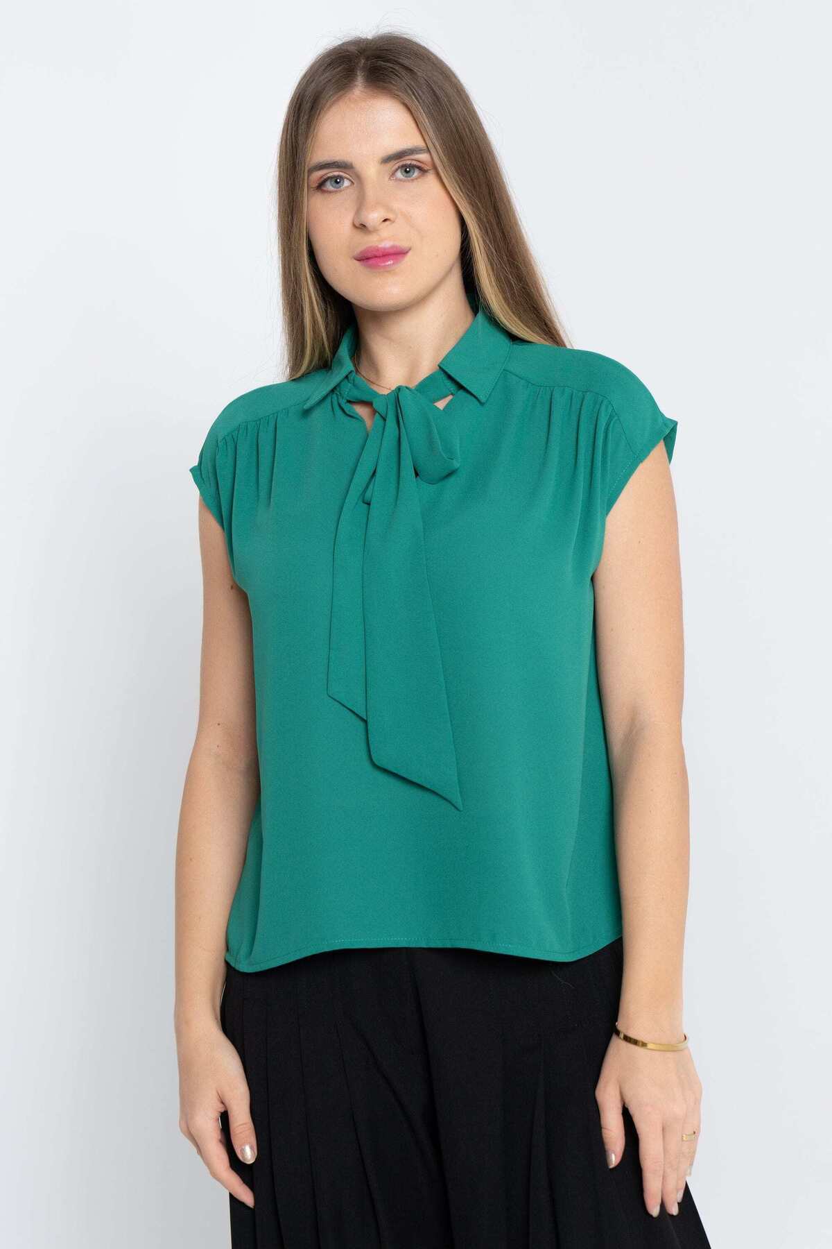 ميزات بلوزة كلاسيكية سادة بأكمام قصيرة مع فيونكة من Nichii