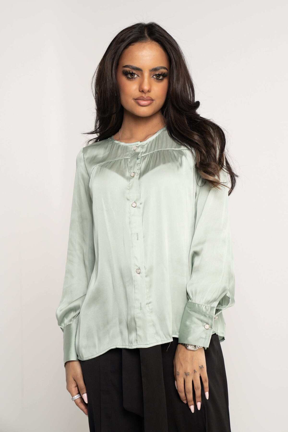 ميزات بلوزة سادة بأكمام طويلة وأزرار أمامية من Nichii