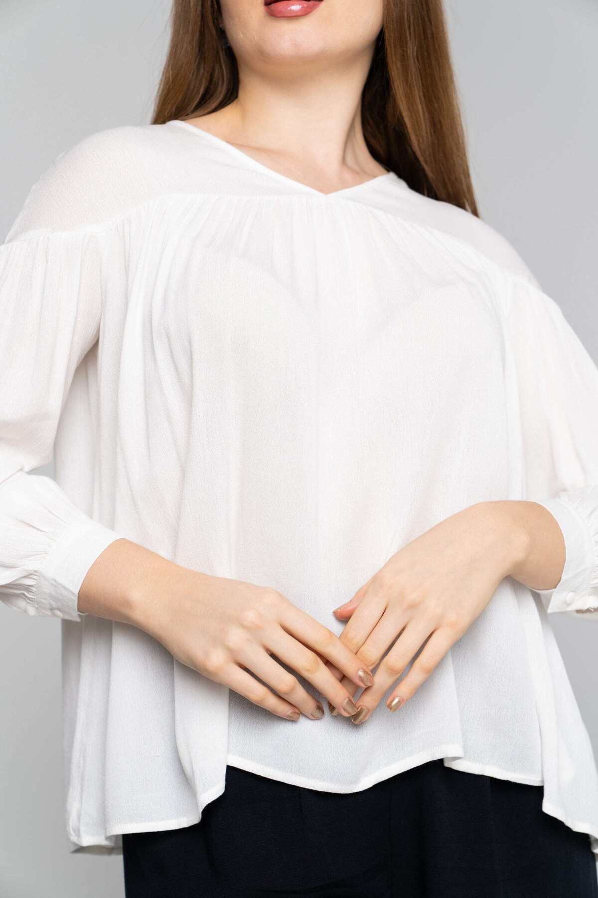 ميزات بلوزة سادة بأكمام طويلة ورقبة على شكل حرف V من Nichii