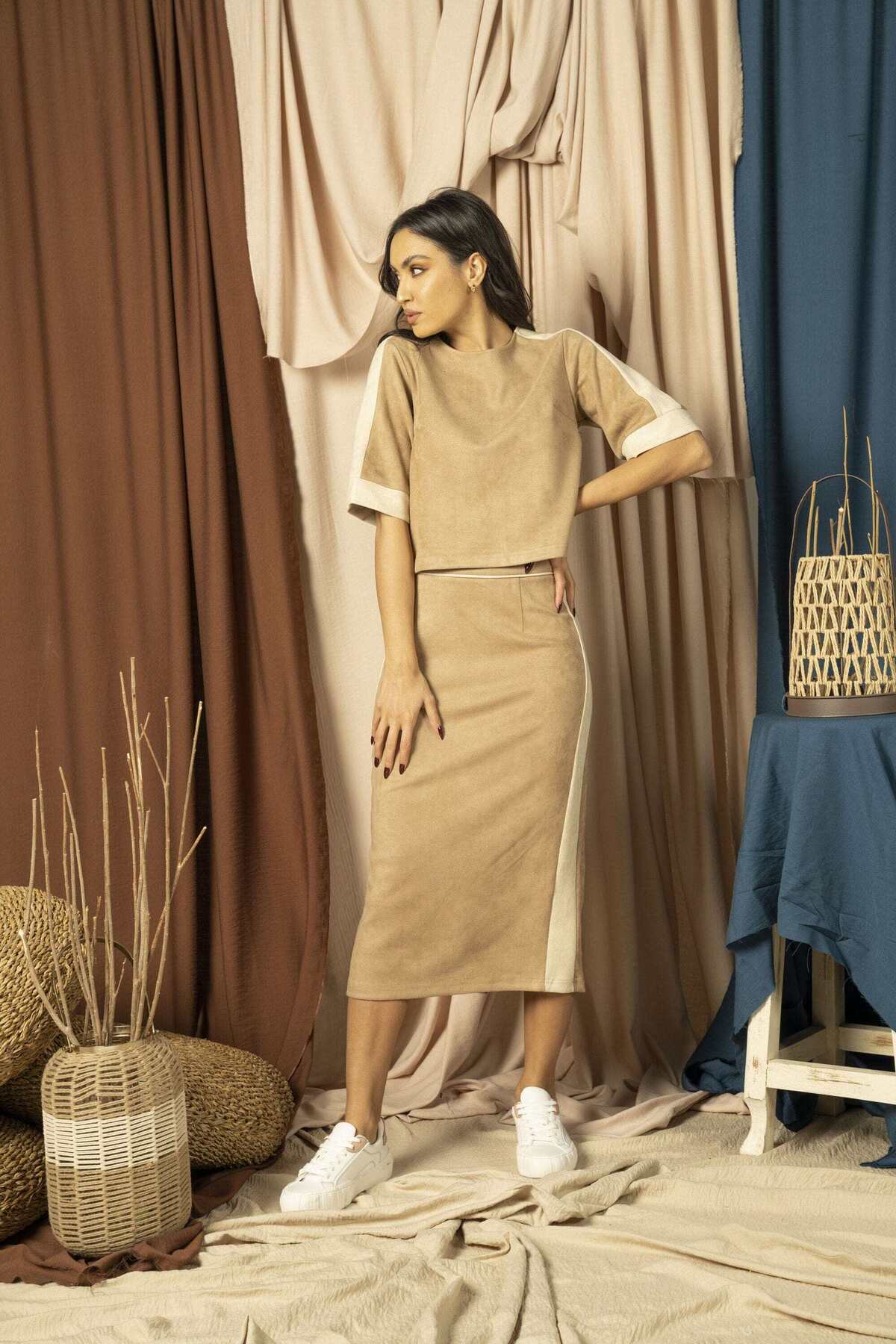 ميزات تنورة ميدي مخططة جانبية سادة من Nichii