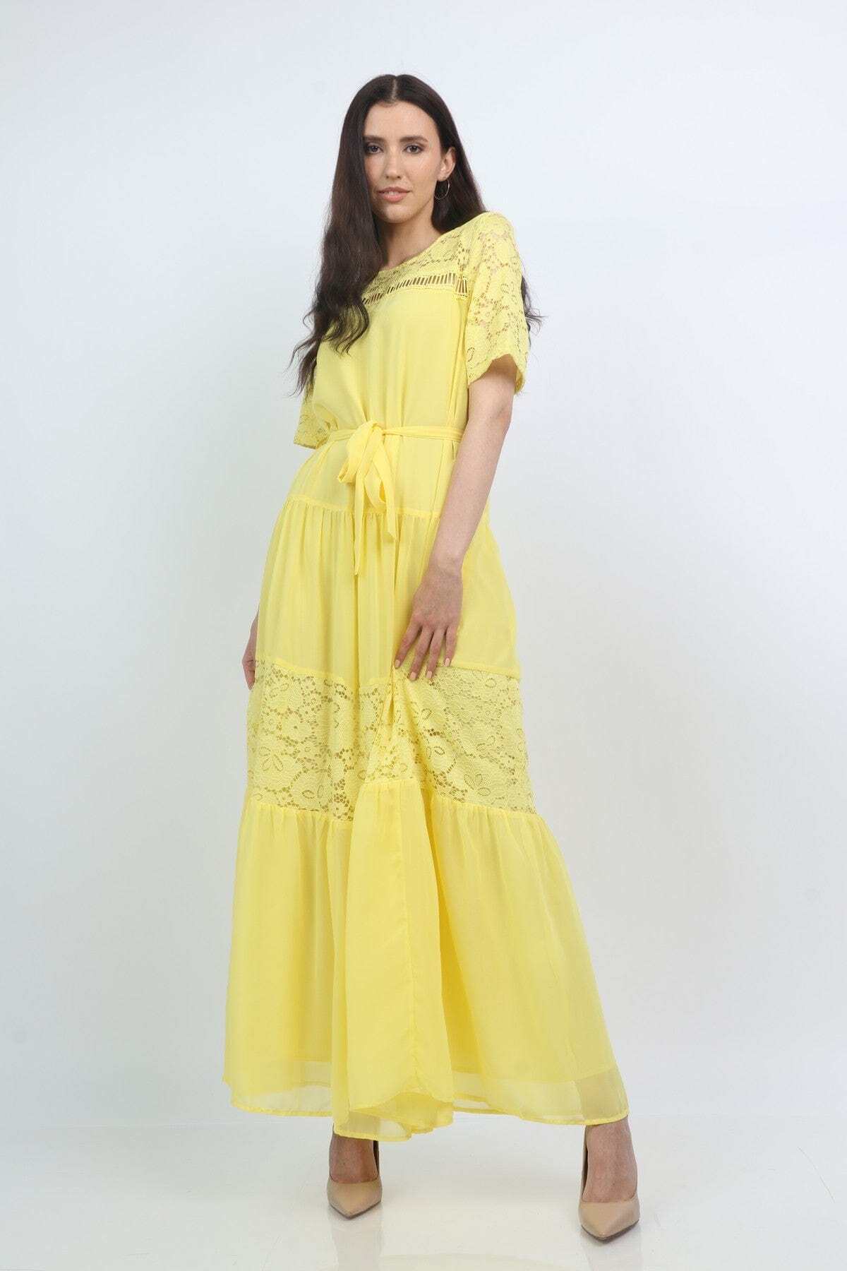 ميزات فستان ماكسي أصفر سادة بحزام من Nichii