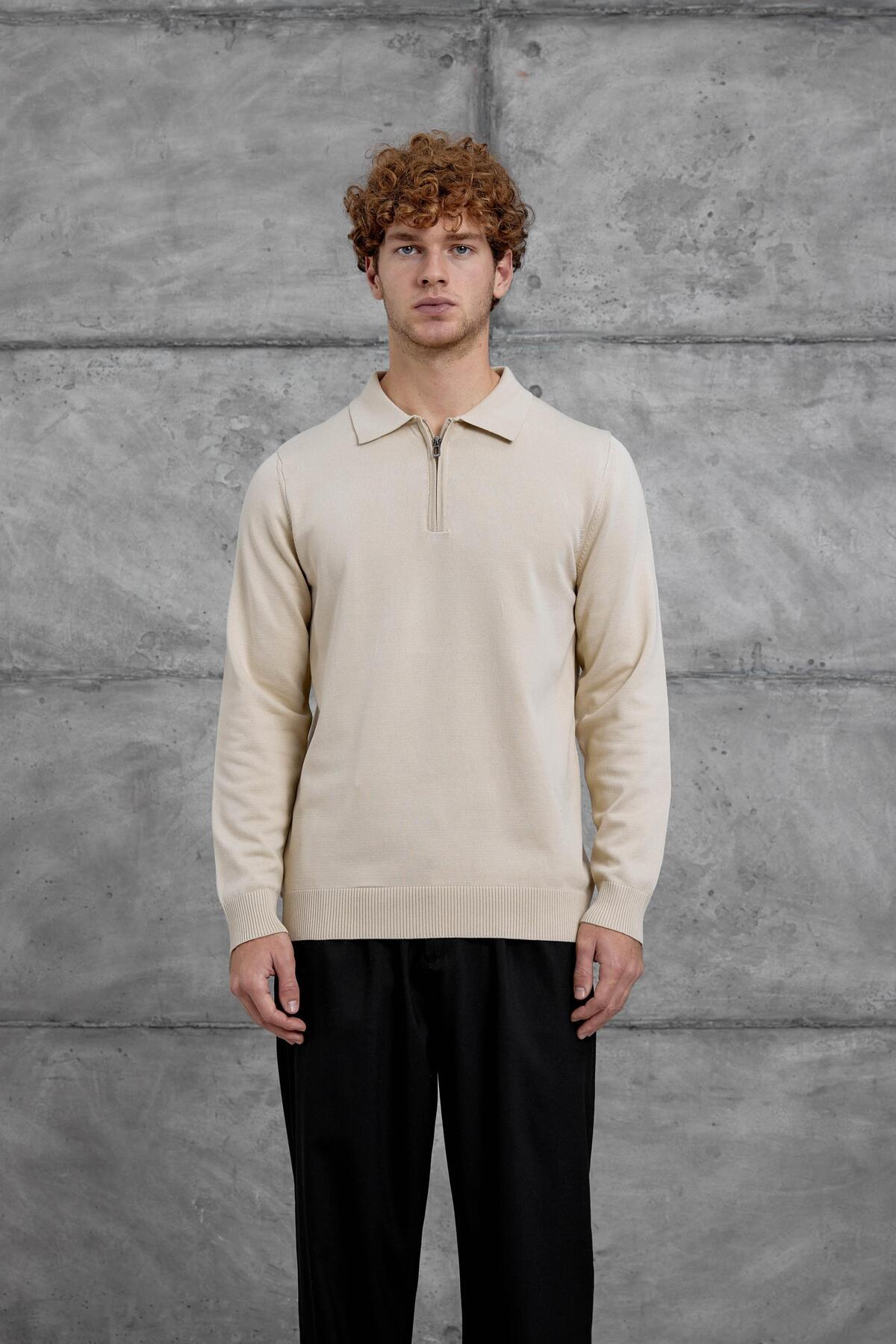 NOMARC ملابس تريكو أساسية بياقة بولو ونصف سحاب باللون البيج 251