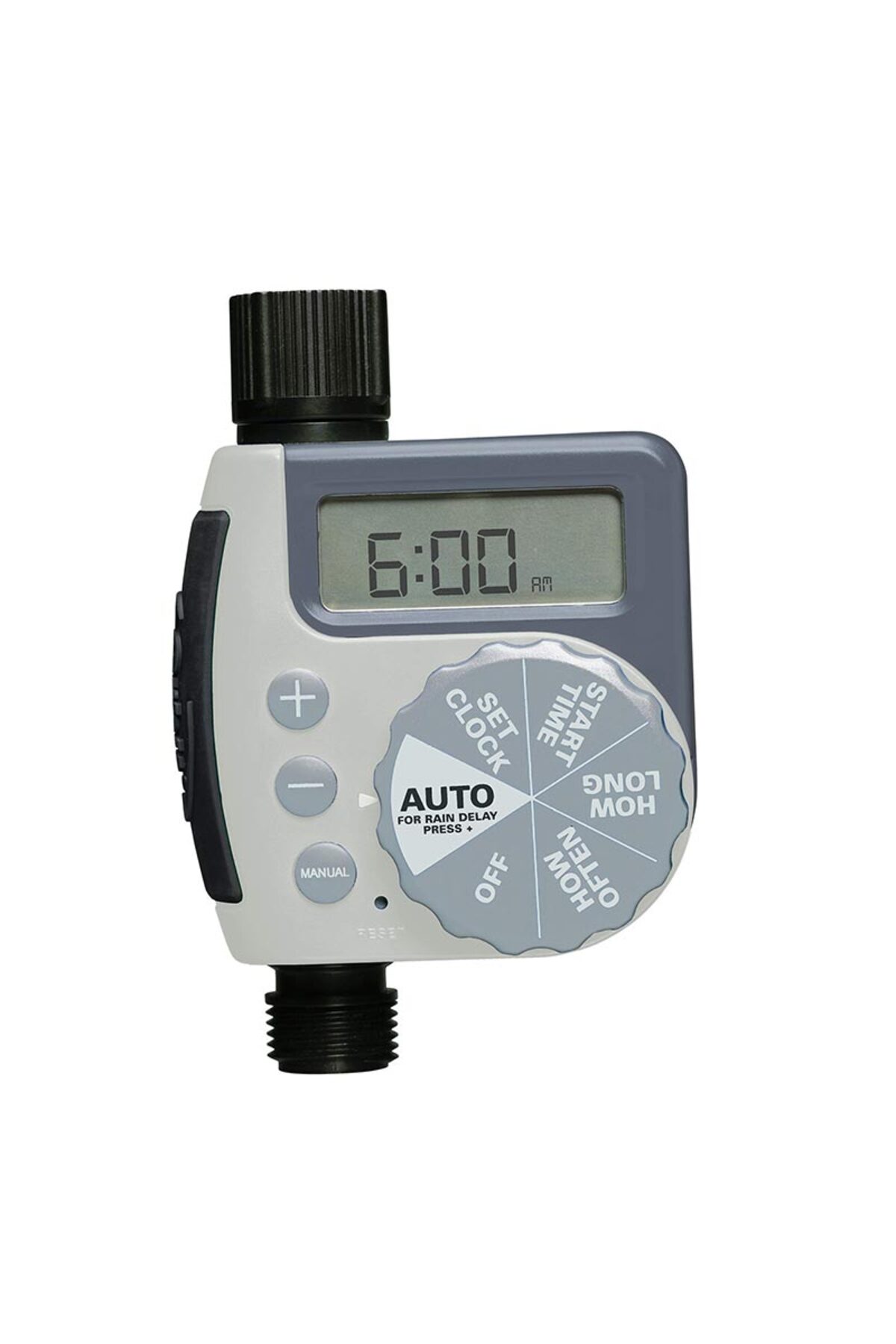 large digital display, manual override, rain delay, water-resistant construction