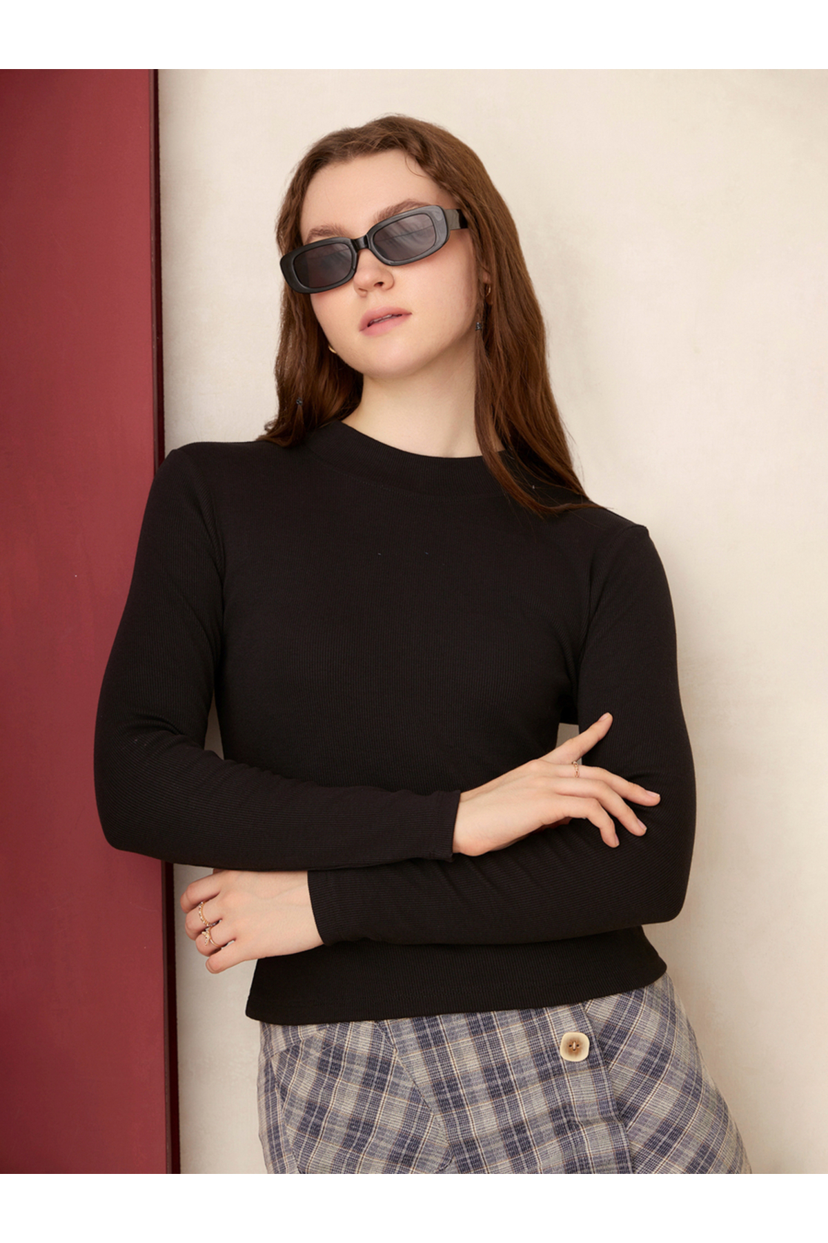 Outzidr By Styli بلوزة سوداء سادة أساسية مضلعة ملائمة