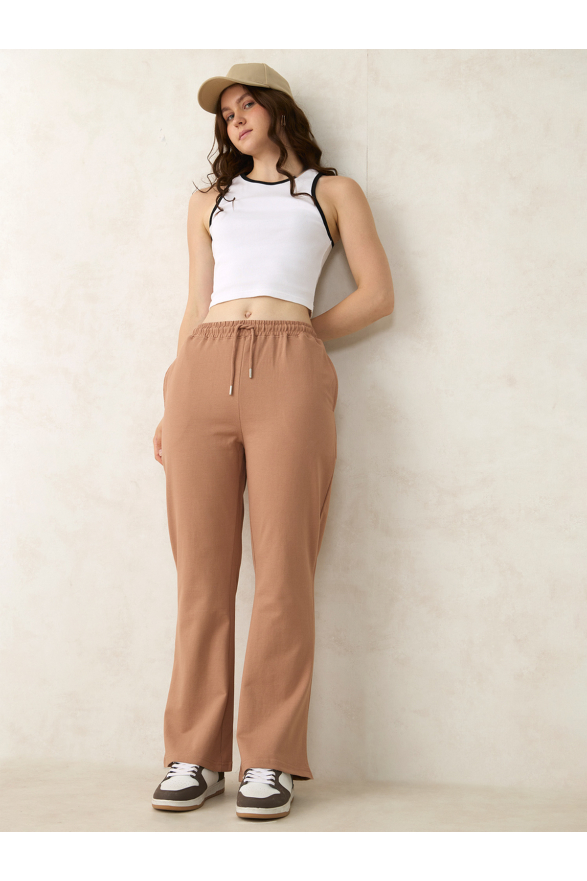 Outzidr By Styli بنطال رياضي بني سادة أساسي واسع الأرجل