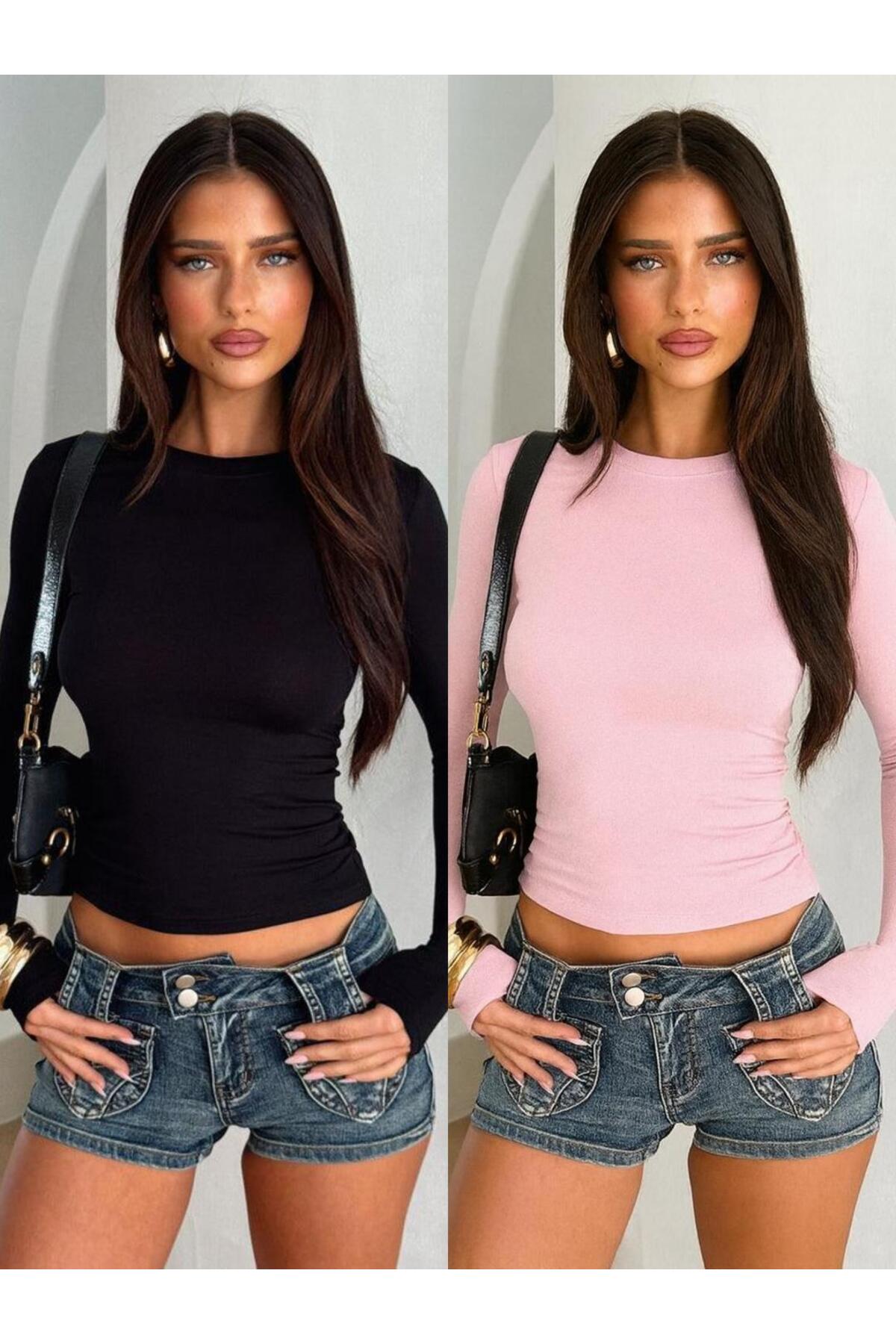 ÖZ PAMUK قطعتان من البلوزات ذات الأكمام الطويلة ذات الرقبة الدائرية قماش قابل للتمدد بلوزة سادة