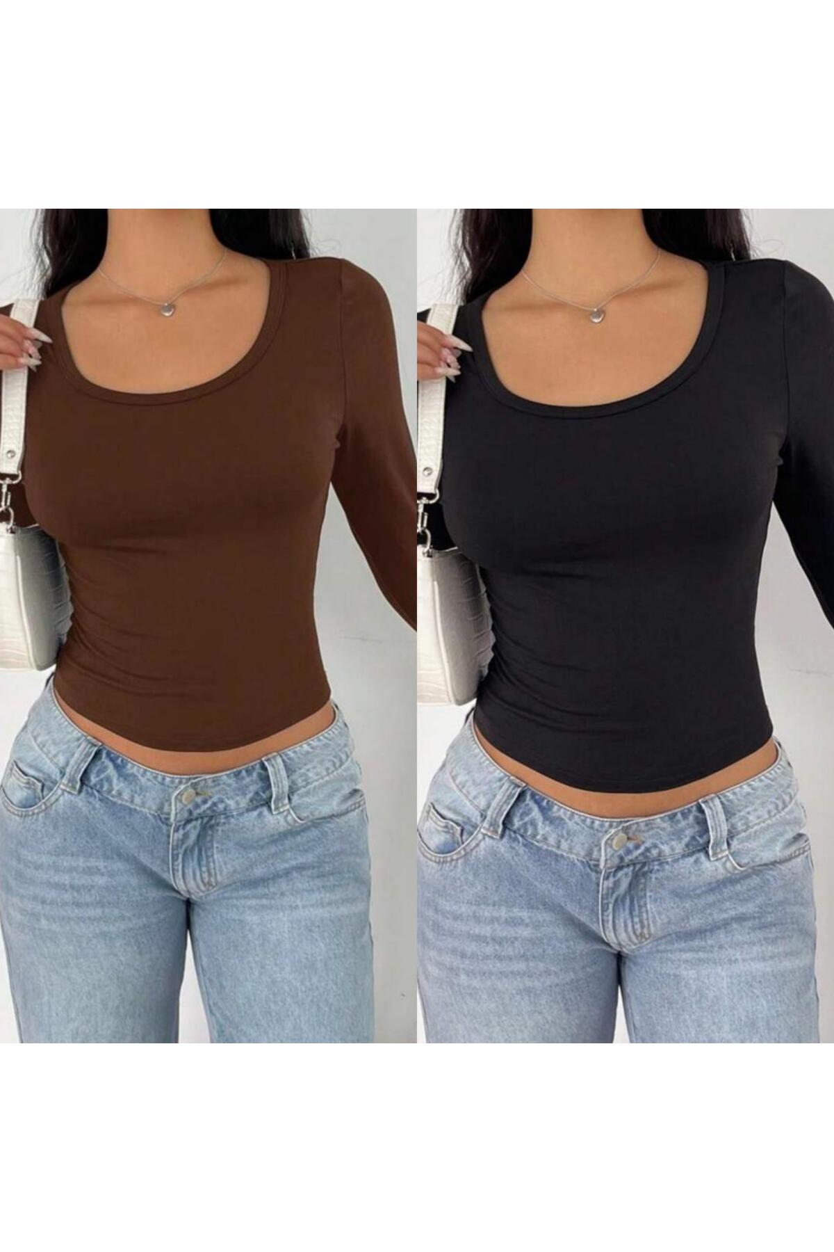 ÖZ PAMUK قطعتان من البلوزات ذات الأكمام الطويلة من قماش الليكرا ذو الياقة المربعة