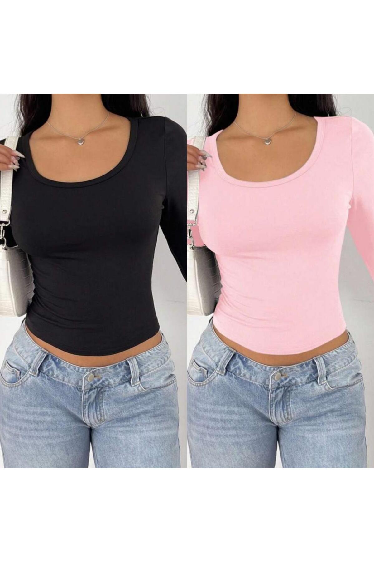 ÖZ PAMUK قطعتان من البلوزات ذات الأكمام الطويلة من قماش الليكرا ذو الياقة المربعة