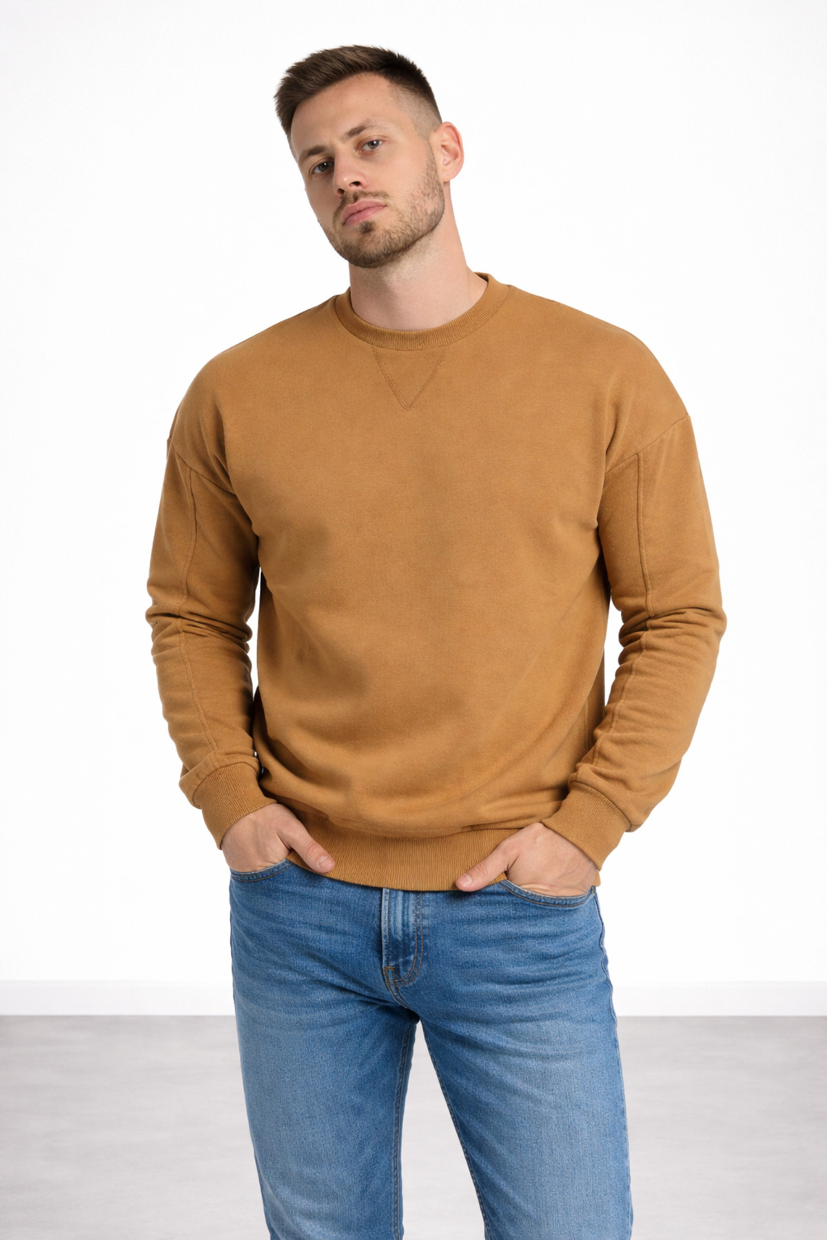 ميزات سويت شيرت رجالي بني اللون بثلاثة خيوط وياقة دائرية سميكة واسعة الحجم من Polo State