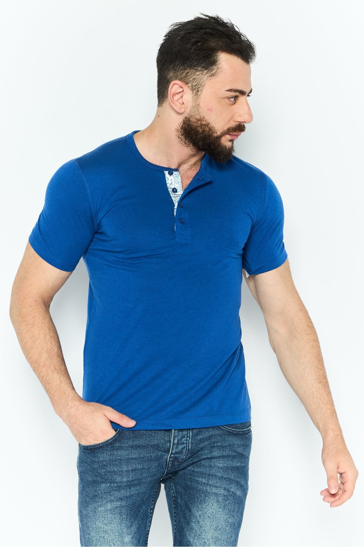 ميزات تي شيرت رجالي سادة بأكمام قصيرة وياقة واقفة، أزرق من Project Essentials
