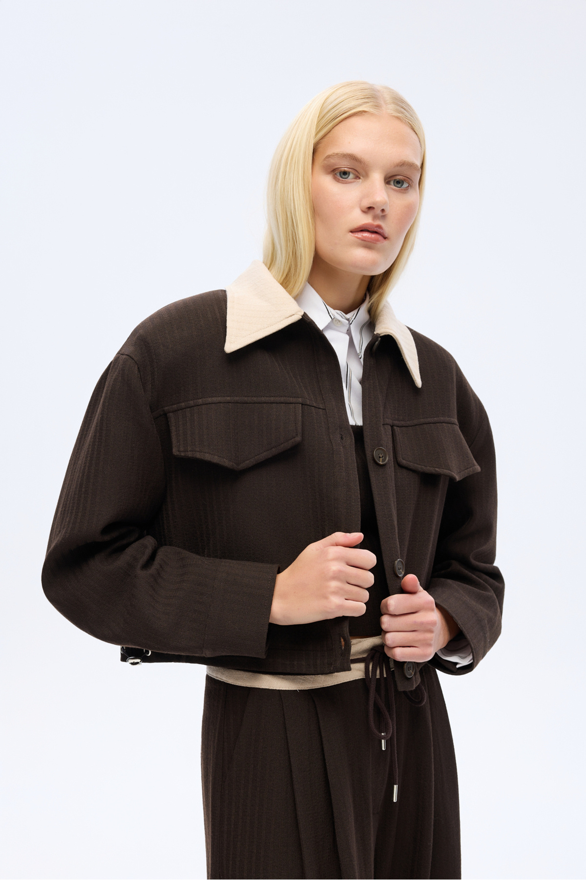 ميزات سترة قصيرة بياقة متباينة الألوان وأزرار باللون البني من Quzu