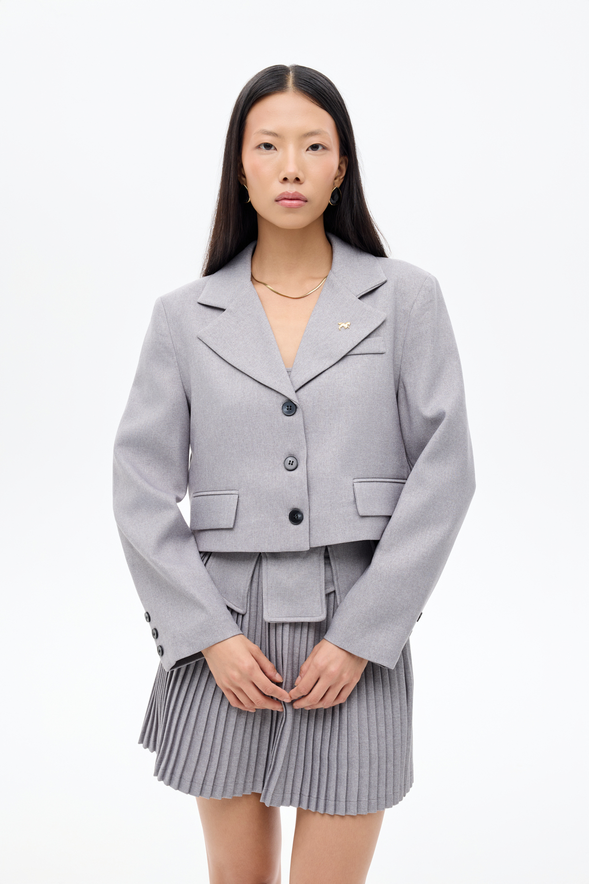ميزات سترة بليزر قصيرة بأزرار مع إكسسوارات بروش باللون الرمادي من Quzu