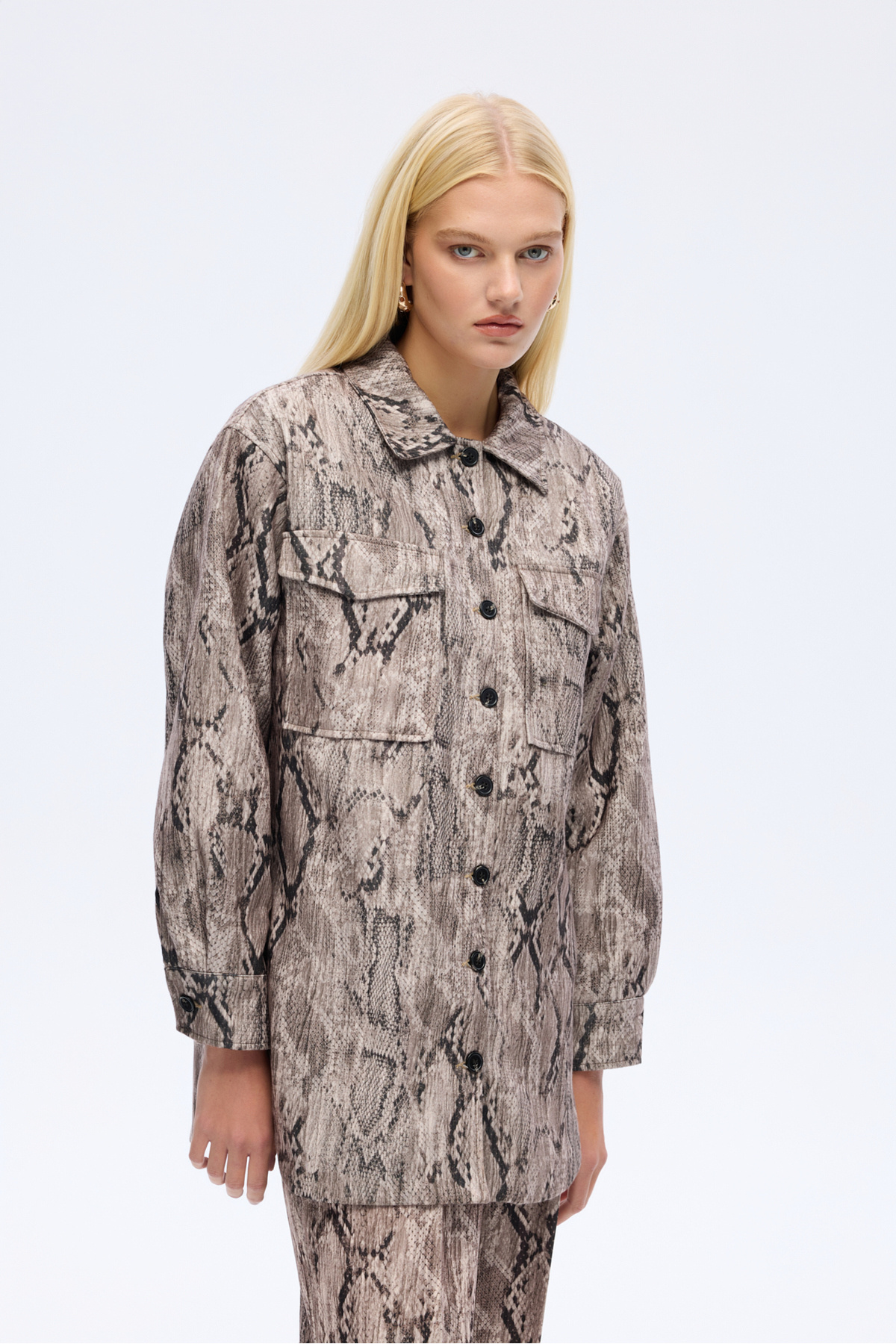 Quzu قميص كبير الحجم بنقشة ثعبان باللون البني