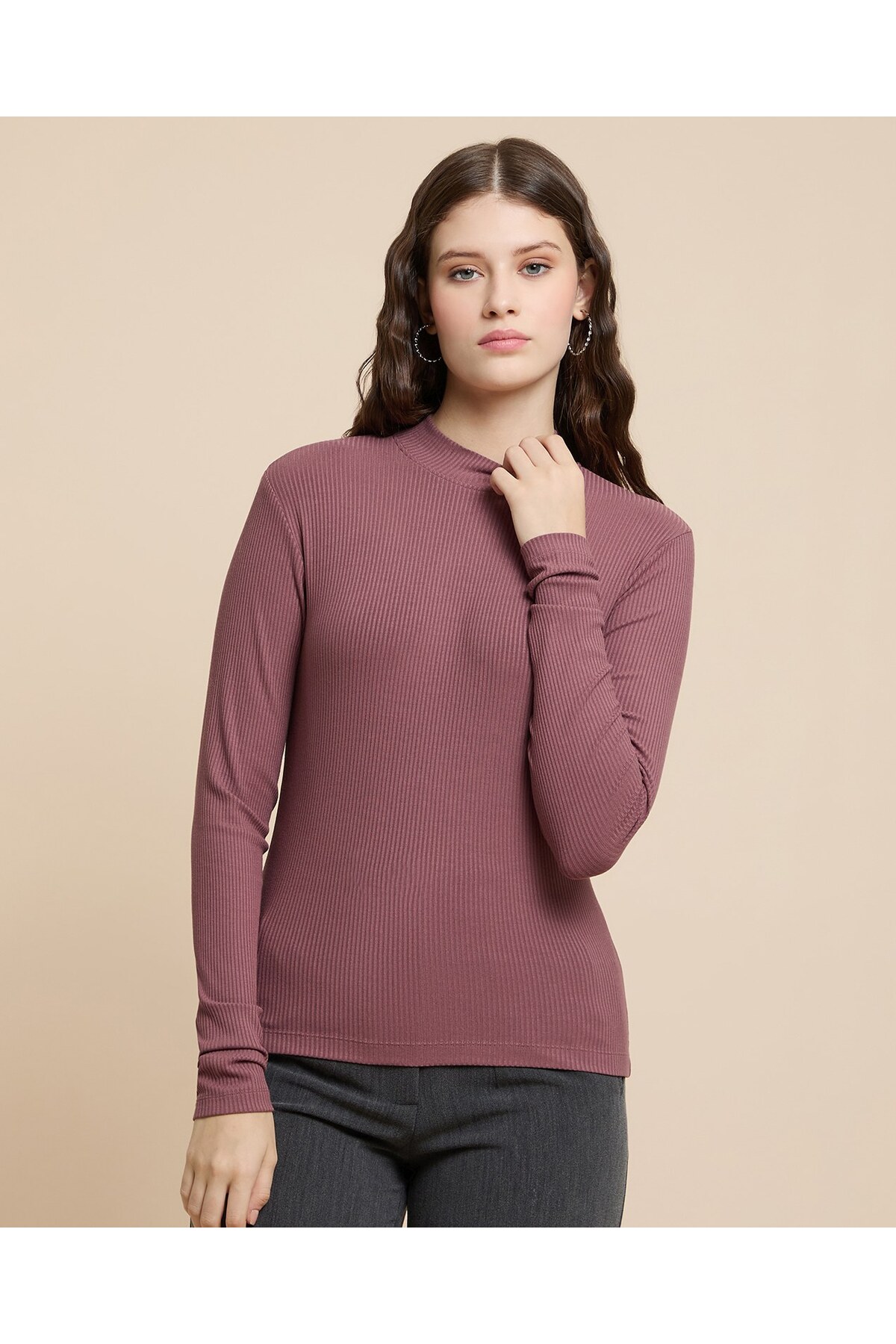 ميزات بلوزة سادة بياقة دائرية وأكمام طويلة من R&B