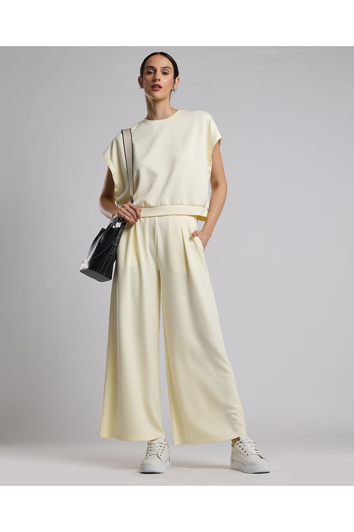 ميزات بنطال سادة واسع الساق مع زر للإغلاق من R&B