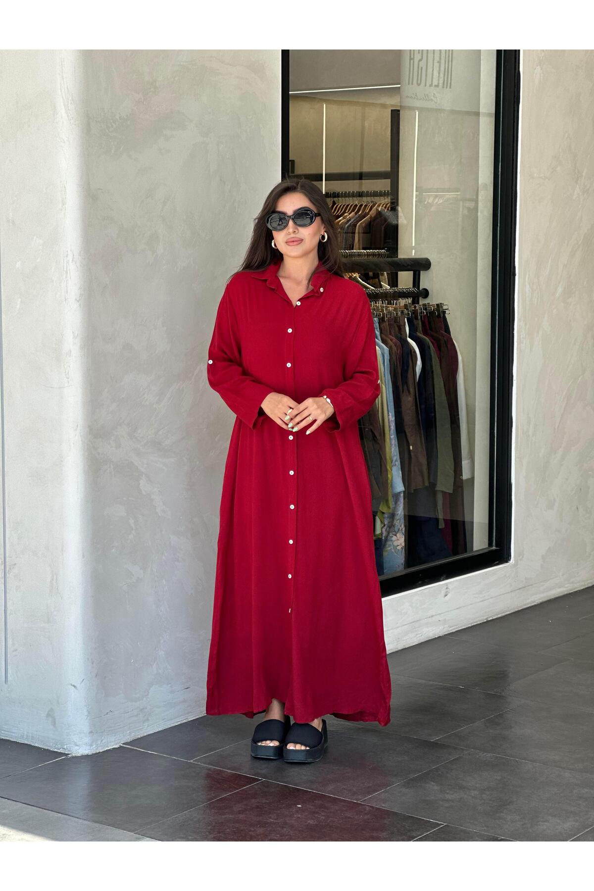 ميزات فستان قميص أساسي طويل بأزرار باللون الأحمر من Ranasubaşı