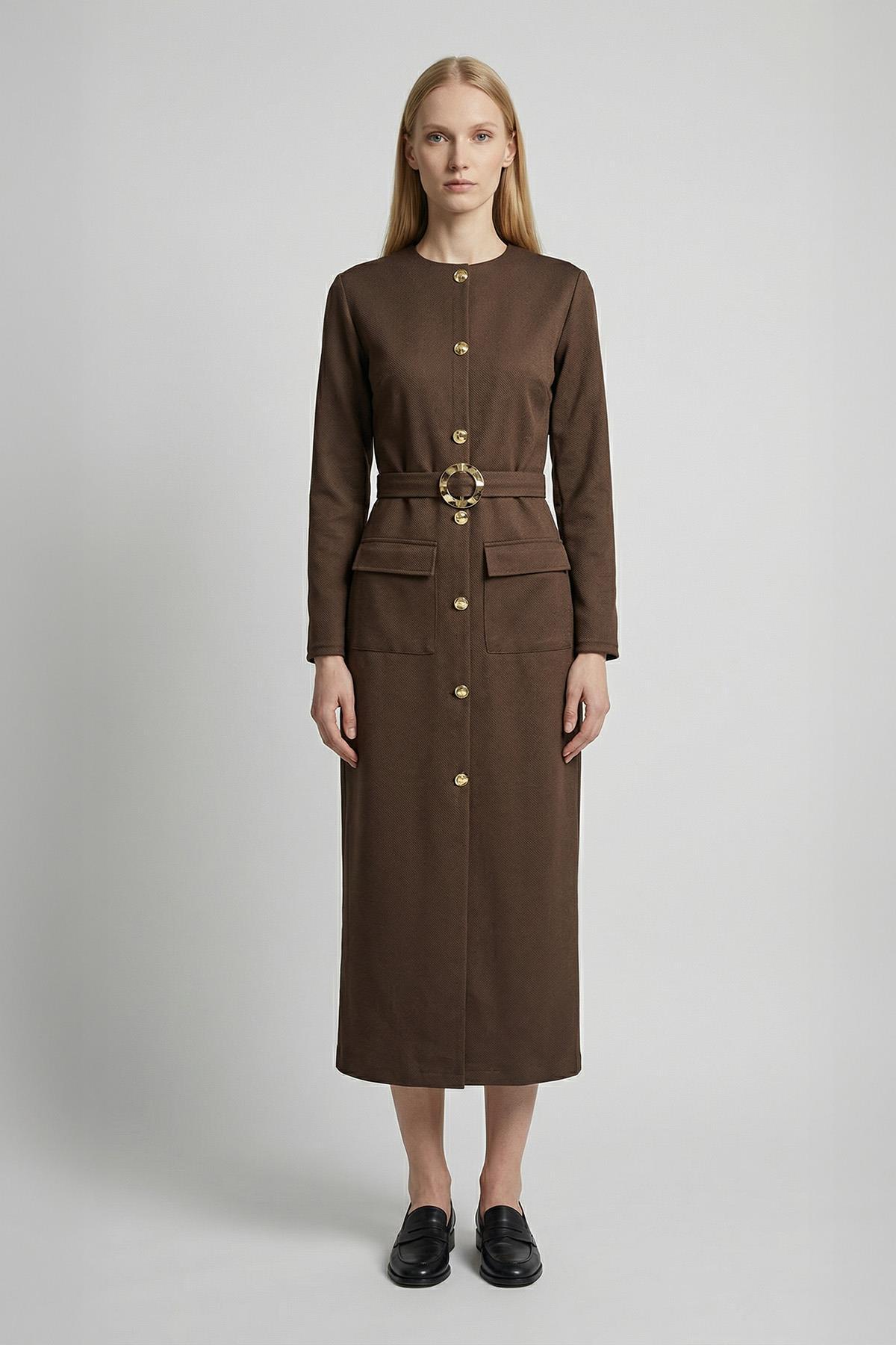 Rays 8258A فستان بجيوب وأزرار باللون البني
