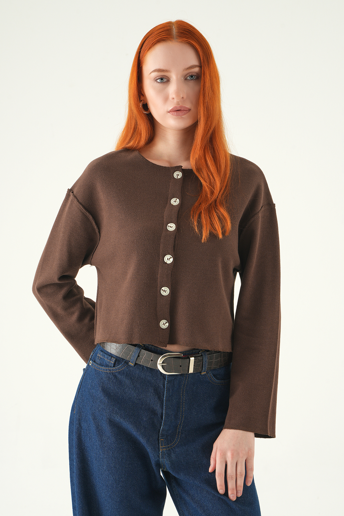 Rays 8273A بلوزة بياقة دائرية وأزرار باللون البني