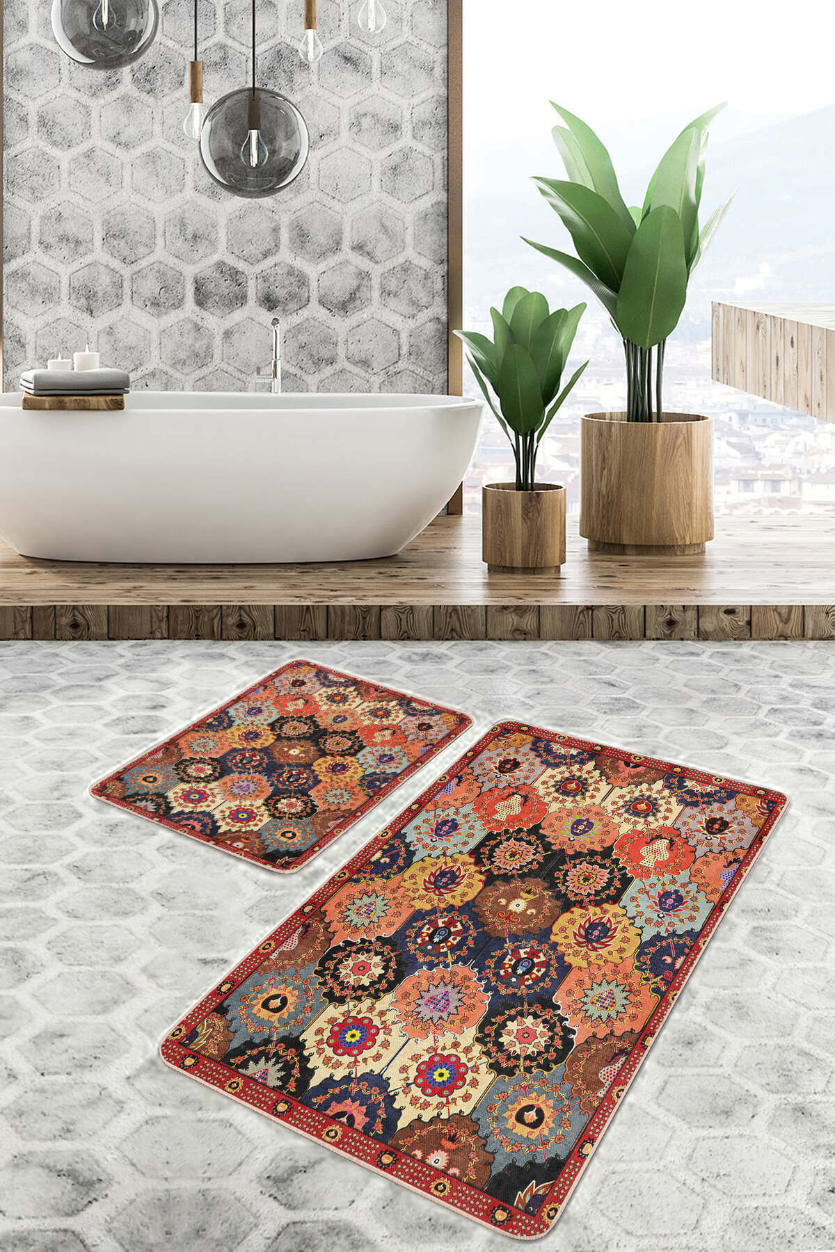 ميزات مجموعة من قطعتين من سجادة الحمام القابلة للغسل وقاعدة غير قابلة للانزلاق ونمط مرقعة متعددة الألوان من Realhomes