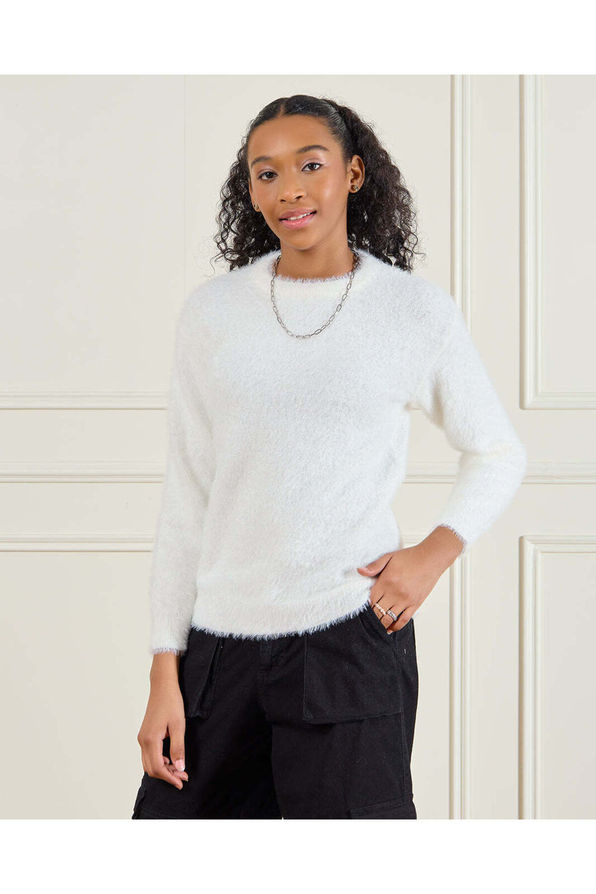 ميزات كنزة صوفية بيضاء من الفرو للبنات الكبيرات من REDTAG
