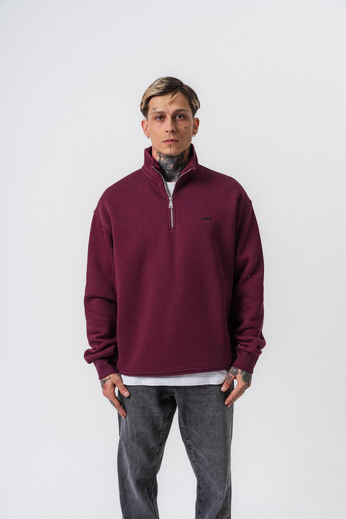 Respire سويت شيرت رجالي بتفاصيل نصية ونصف سحاب أساسي باللون الكرزي