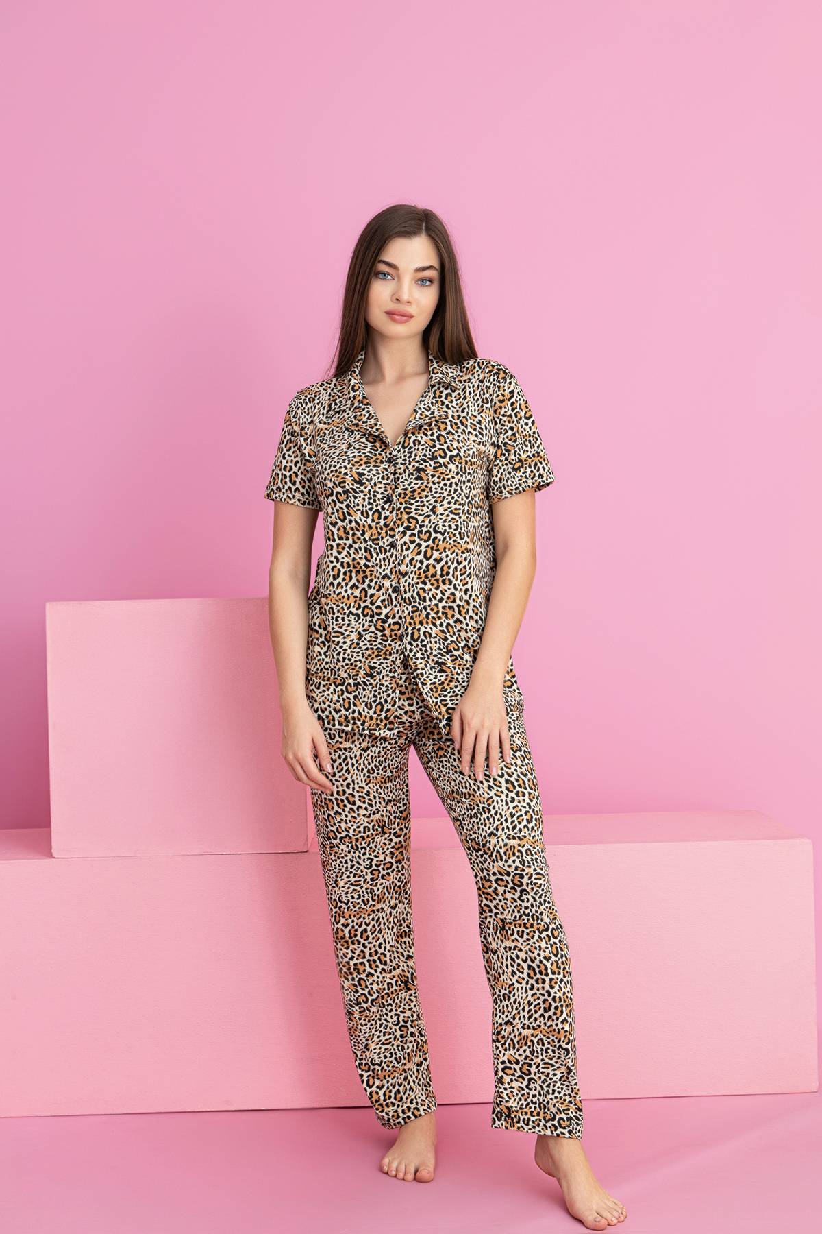 rindahomewear طقم بيجامة نسائي من ميلان بنقشة الفهد وأزرار
