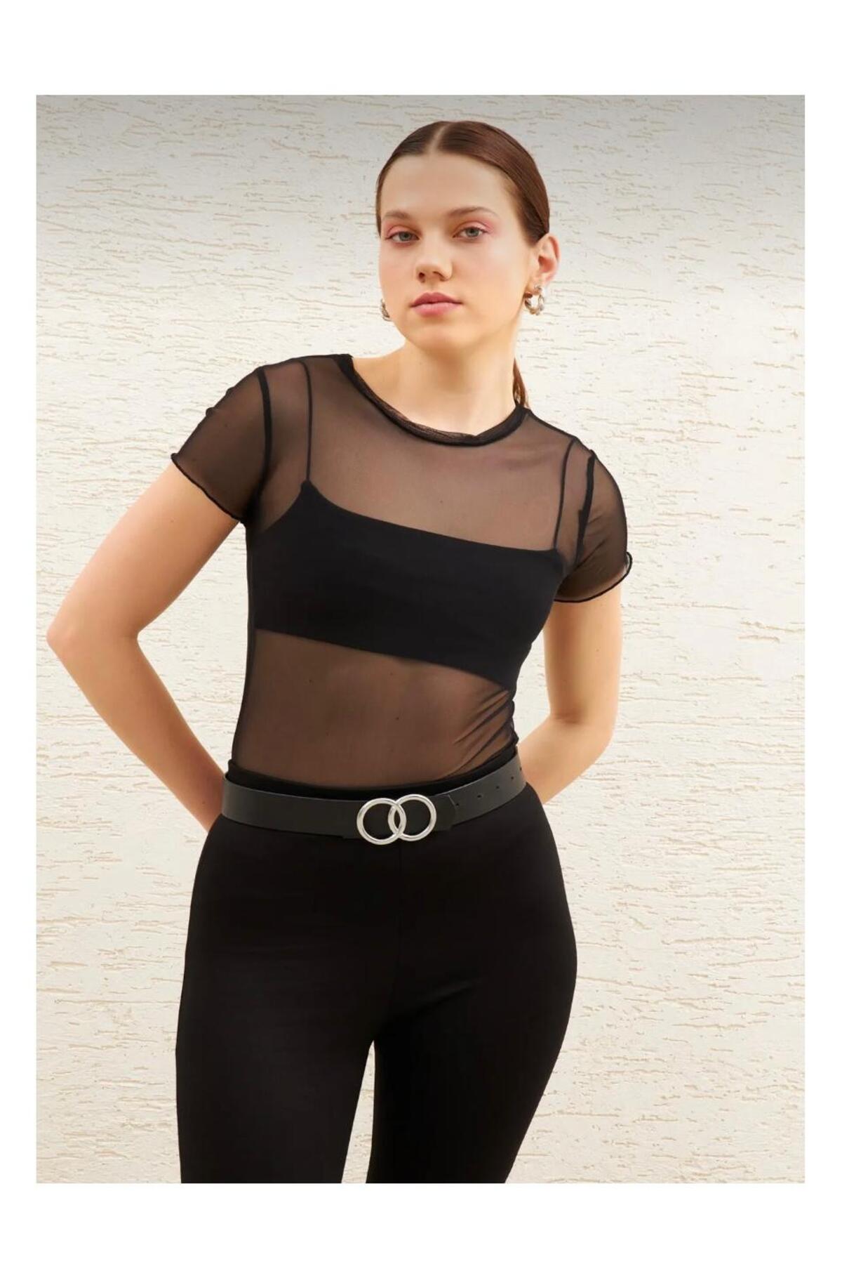 SARI بلوزة سوداء شفافة من التول