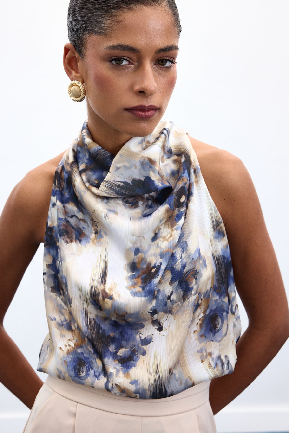 ميزات منسدل بلوزة بتصميم هالتر كولور - نيلي من Sateen