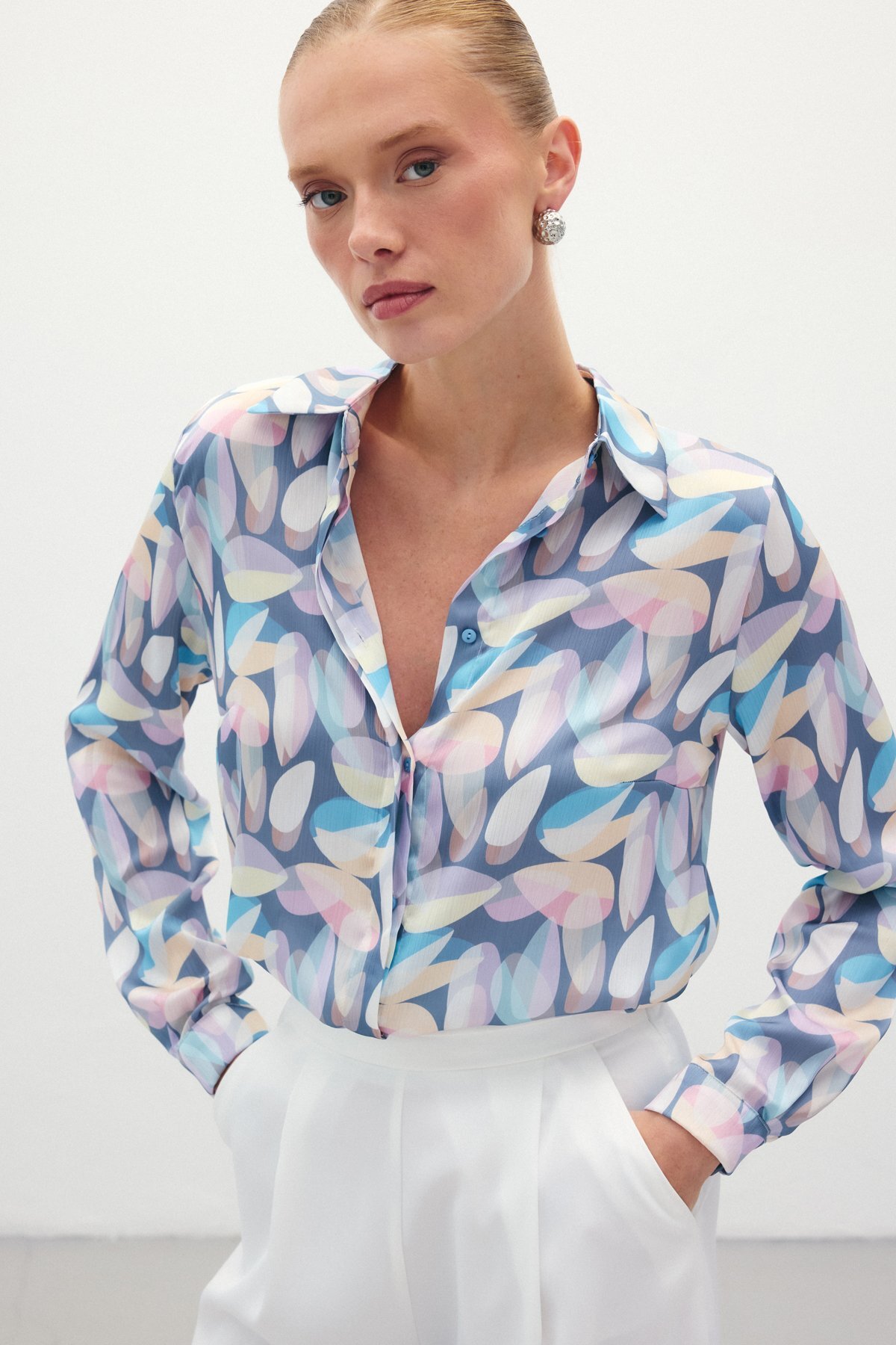 ميزات قميص طويل منقوش - أزرق من Sateen