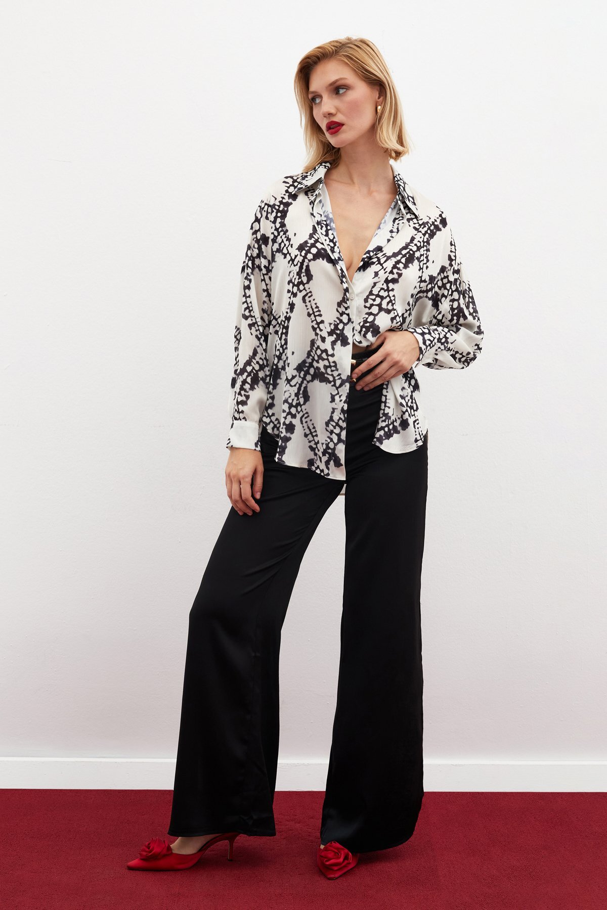 ميزات قميص فضفاض منقوش - أسود من Sateen