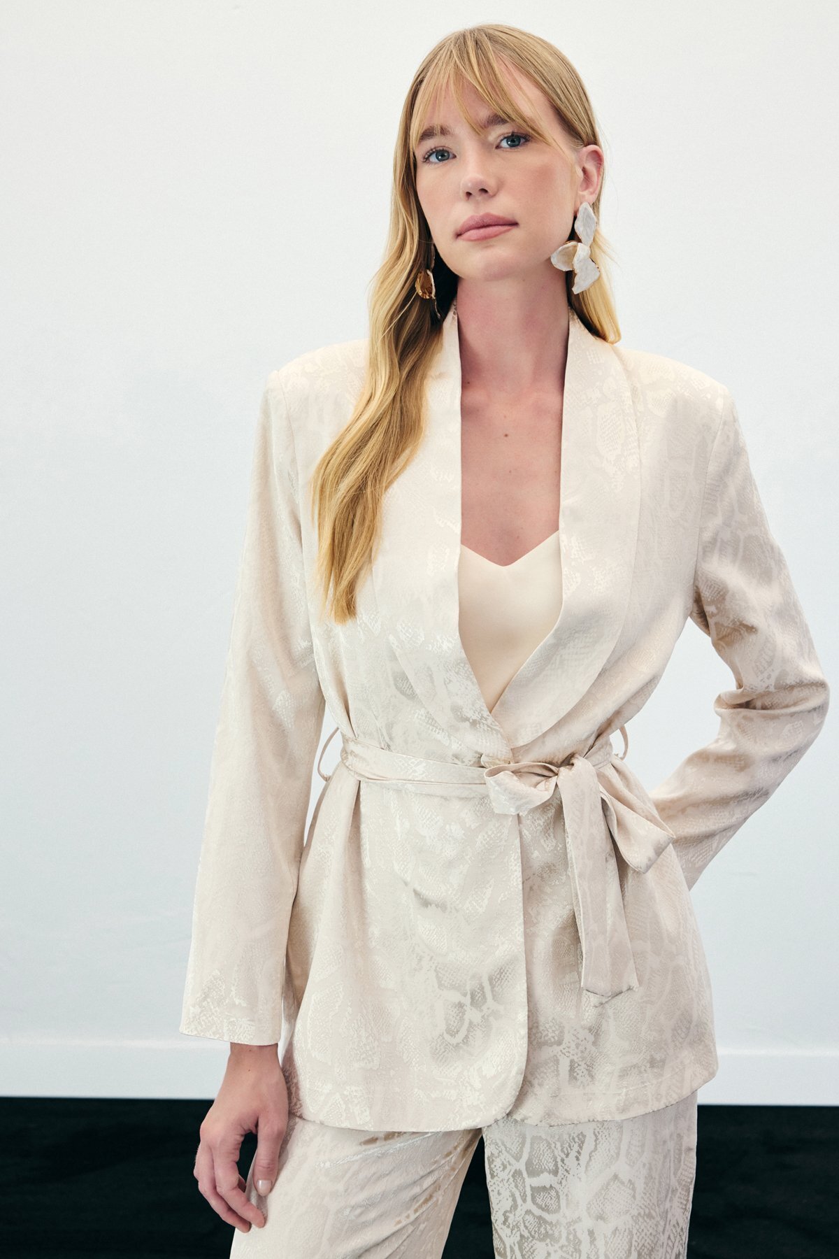 ميزات جاكيت طويل بنقشة ثعبان - بيج من Sateen