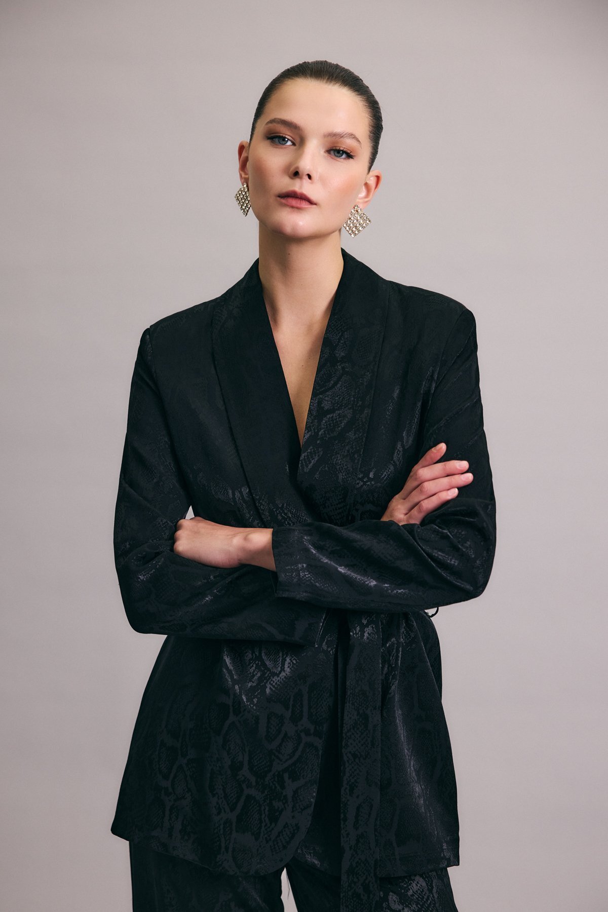 ميزات جاكيت طويل بنقشة الثعبان - أسود من Sateen