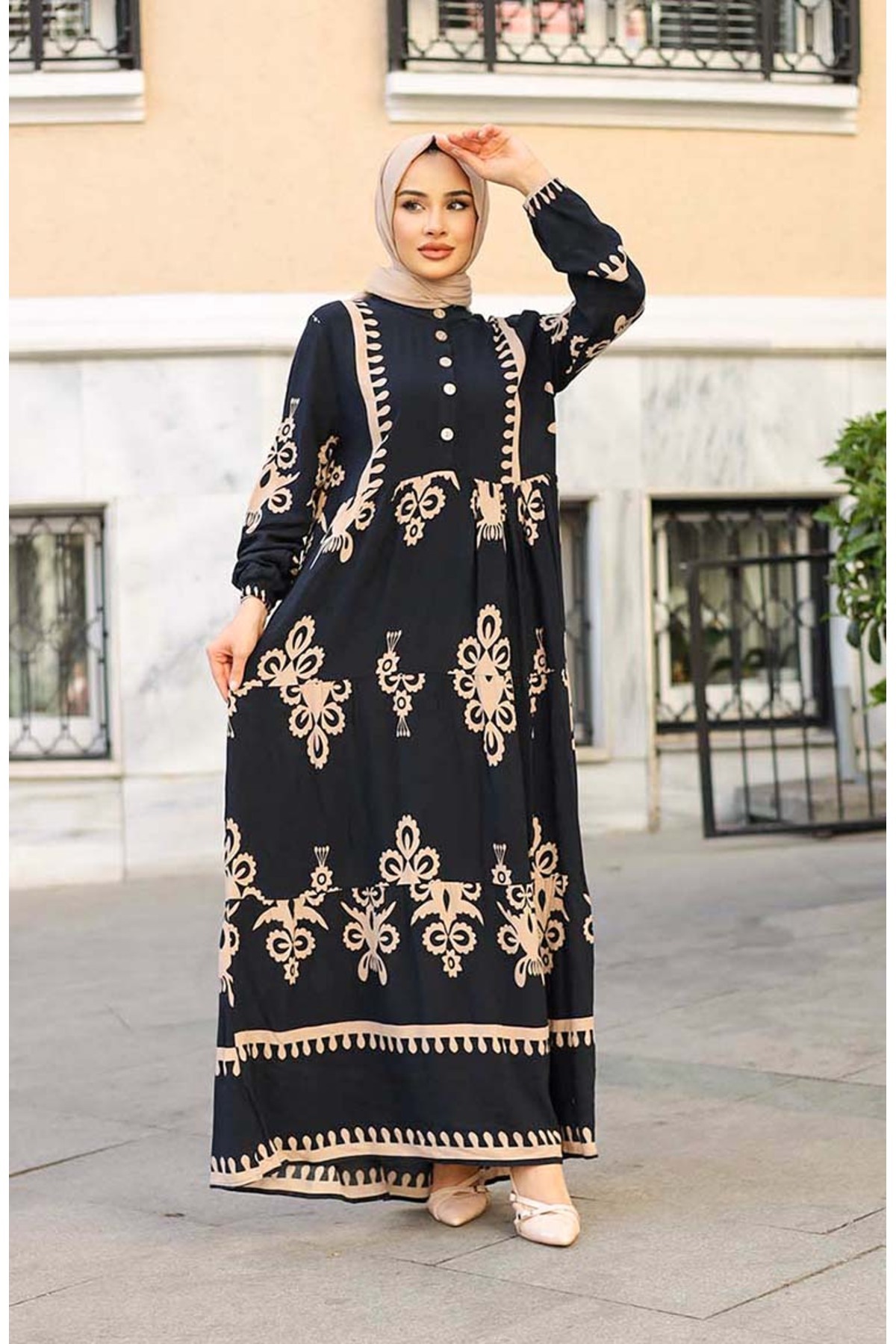 ميزات فستان منقوش باللون الأسود - موديل 4100-07 من sefamerve